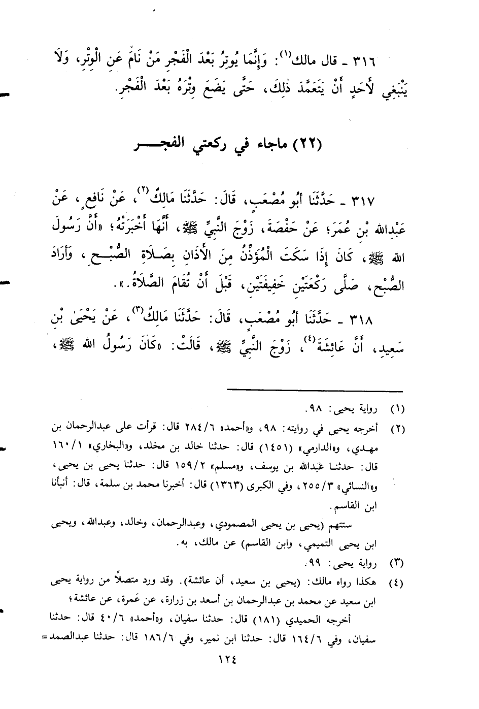 ٣١٨ - حَدَّثَنَا أَبُو مُصْعَبٍ، قَالَ: حَدَّثَنَا مَالِكٌ، عَنْ يَحْيَى بْنِ سَعِيدٍ، أَنَّ عَائِشَةَ زَوْجَ النَّبِيِّ صَلى الله عَلَيه وَسَلم، قَالَتْ: كَانَ رَسُولُ اللَّهِ صَلى الله عَلَيه وَسَلم لَيُخَفِّفُ رَكْعَتَيِ الْفَجْرِ، حَتَّى إن كنت إِنِّي لَأَقُولُ: أَقَرَأَ فيهما بِأُمِّ الْقُرْآنِ أَمْ لا؟.