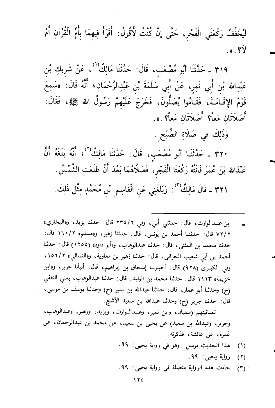 ٣١٩ - حَدَّثَنَا أَبُو مُصْعَبٍ، قَالَ: حَدَّثَنَا مَالِكٌ، عَنْ شَرِيكِ بْنِ عَبْدِ اللَّهِ بْنِ أَبِي نَمِرٍ، عَنْ أَبِي سَلَمَةَ بْنِ عَبْدِ الرَّحْمَنِ، أَنَّهُ قَالَ: سَمِعَ قَوْمٌ الْإِقَامَةَ، فَقَامُوا يُصَلُّونَ، فَخَرَجَ عَلَيْهِمْ رَسُولُ اللَّهِ صَلى الله عَلَيه وَسَلم، فَقَالَ: أَصَلَاتَانِ مَعًا؟ أَصَلَاتَانِ مَعًا؟.
