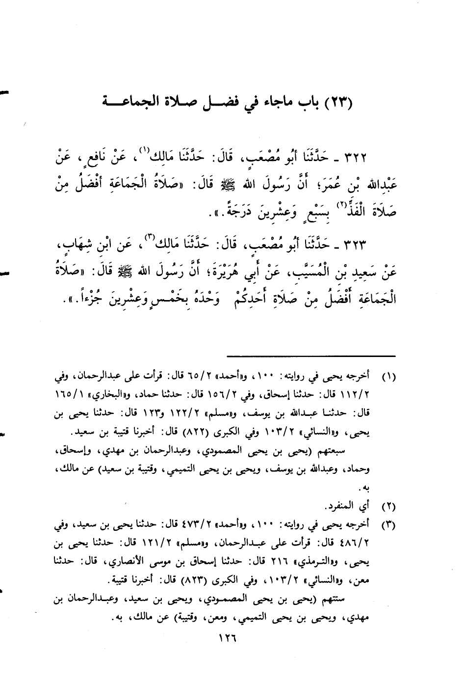 ٣٢٢ - حَدَّثَنَا أَبُو مُصْعَبٍ، قَالَ: حَدَّثَنَا مَالِكٌ، عَنْ نَافِعٍ، عَنْ عَبْدِ اللَّهِ بْنِ عُمَرَ، أَنَّ رَسُولَ اللَّهِ صَلى الله عَلَيه وَسَلم، قَالَ: صَلَاةُ الْجَمَاعَةِ أفْضُلُ من صَلَاةَ الْفَذِّ بِسَبْعٍ وَعِشْرِينَ دَرَجَةً.
