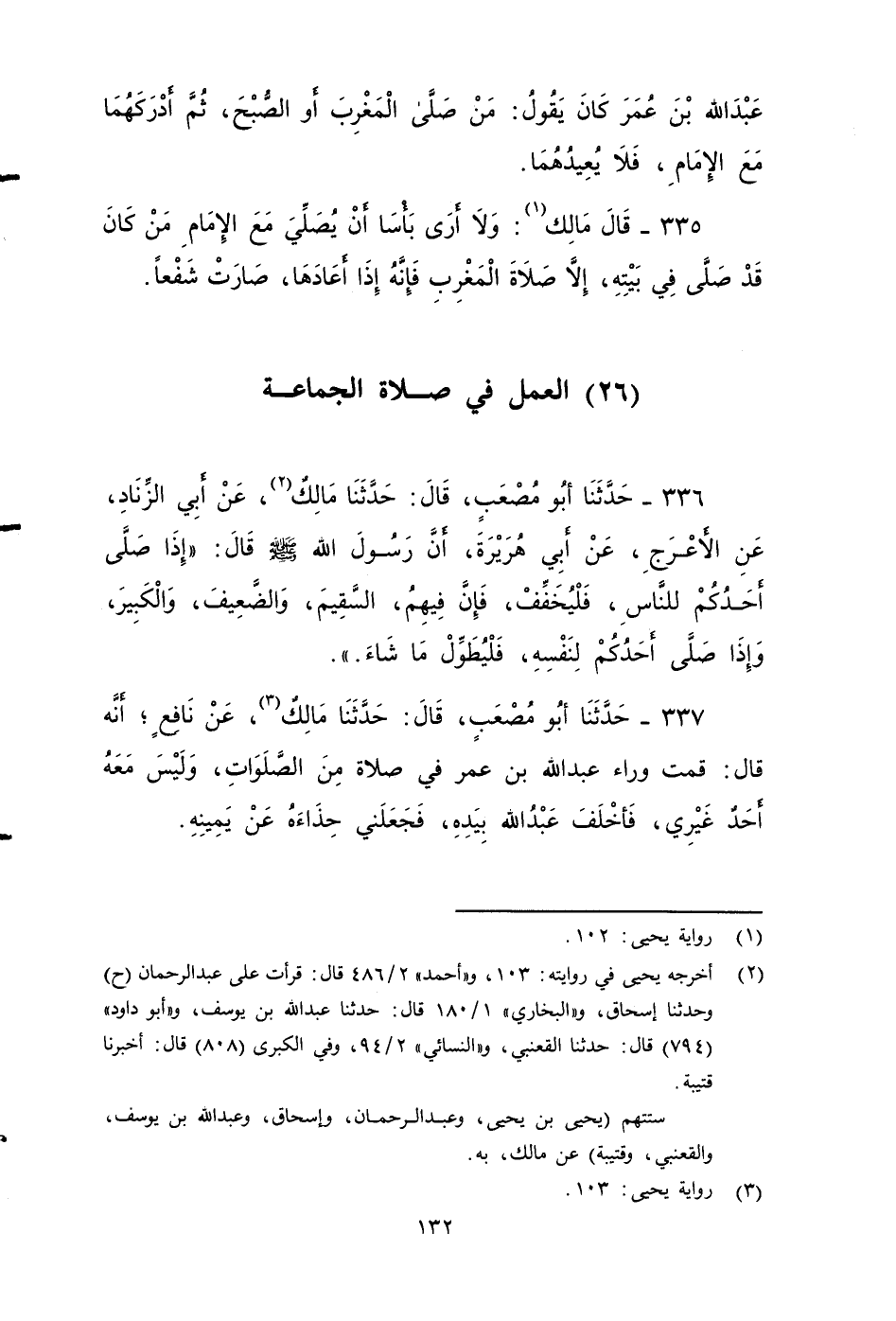 ٣٣٧ - حَدَّثَنَا أَبُو مُصْعَبٍ، قَالَ: حَدَّثَنَا مَالِكٌ، عَنْ نَافِعٍ، أَنَّهُ قَالَ: قُمْتُ وَرَاءَ عَبْدِ اللهِ بْنِ عُمَرَ فِي صَلَاةٍ مِنَ الصَّلَوَاتِ، وَلَيْسَ مَعَهُ أَحَدٌ غَيْرِي، فَأخَلَفَ عَبْدُ اللهِ بِيَدِهِ، فَجَعَلَنِي حِذَاءَهُ عَنْ يَمِينِهِ.