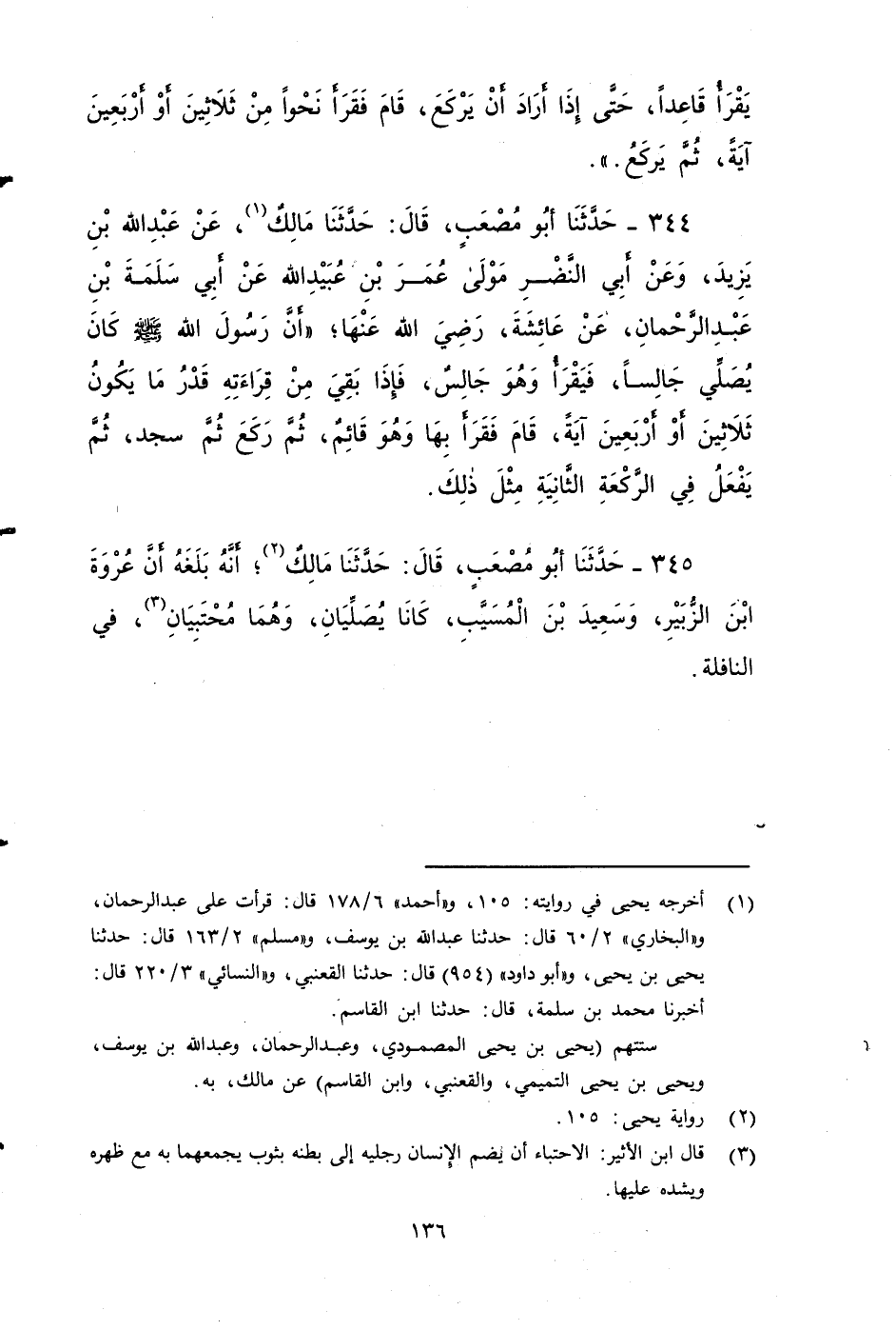 ٣٤٥ - حَدَّثَنَا أَبُو مُصْعَبٍ، قَالَ: حَدَّثَنَا مَالِكٌ؛ أَنَّهُ بَلَغَهُ , أَنَّ عُرْوَةَ بْنَ الزُّبَيْرِ، وَسَعِيدَ بْنَ الْمُسَيَّبِ كَانَا يُصَلِّيَانِ وَهُمَا مُحْتَبِيَانِ، فِي النَّافِلَةِ.