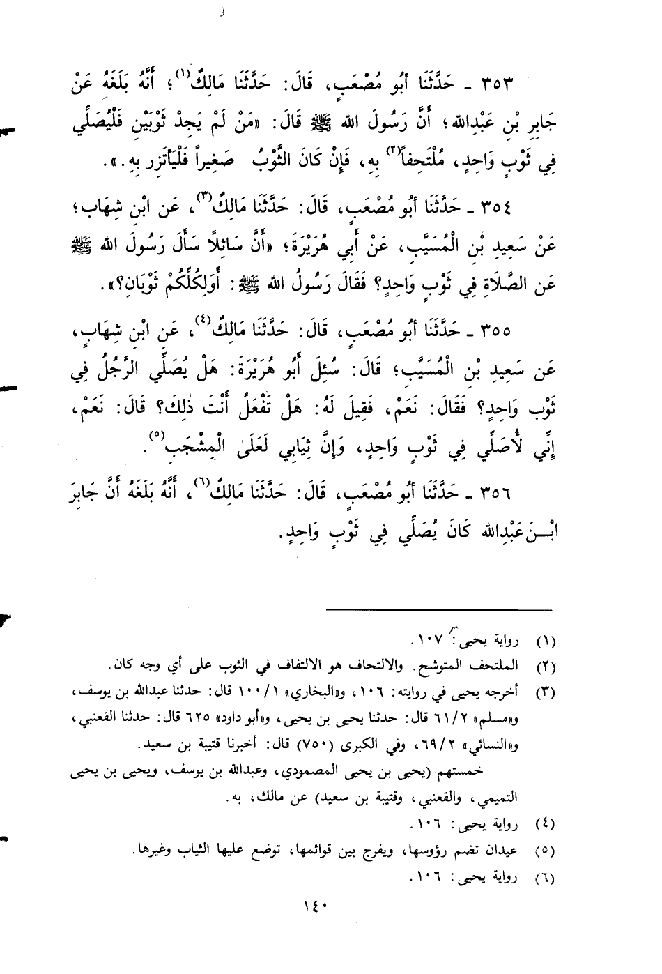 ٣٥٦ - حَدَّثَنَا أَبُو مُصْعَبٍ، قَالَ: حَدَّثَنَا مَالِكٌ؛ أَنَّهُ بَلَغَهُ، أَنَّ جَابِرَ بْنَ عَبْدِ اللهِ كَانَ يُصَلِّي فِي ثَّوْبِ وَاحِدِ.