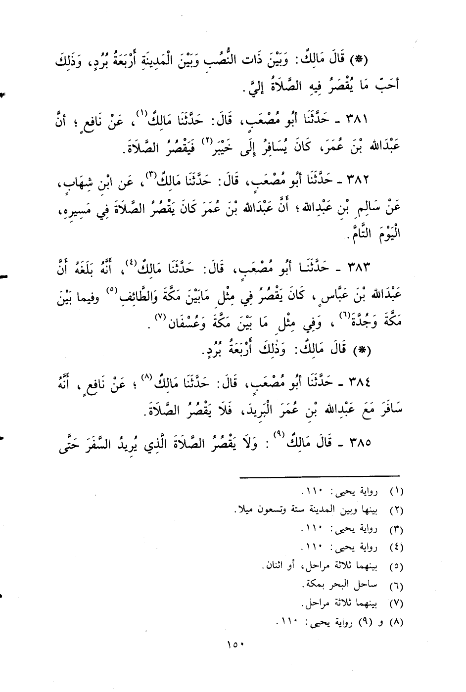 ٣٨٣ - حَدَّثَنَا أَبُو مُصْعَبٍ، قَالَ: حَدَّثَنَا مَالِكٌ؛ أَنَّهُ بَلَغَهُ أَنَّ عَبْدَ اللهِ بْنَ عَبَّاسٍ كَانَ يَقْصُرُ فِي مِثْلِ مَا بَيْنَ مَكَّةَ وَالطَّائِفِ، وَفِيمَا بَيْنَ مَكَّةَ وَجُدَّةَ، وَفِي مِثْلِ مَا بَيْنَ مَكَّةَ وَعُسْفَانَ.