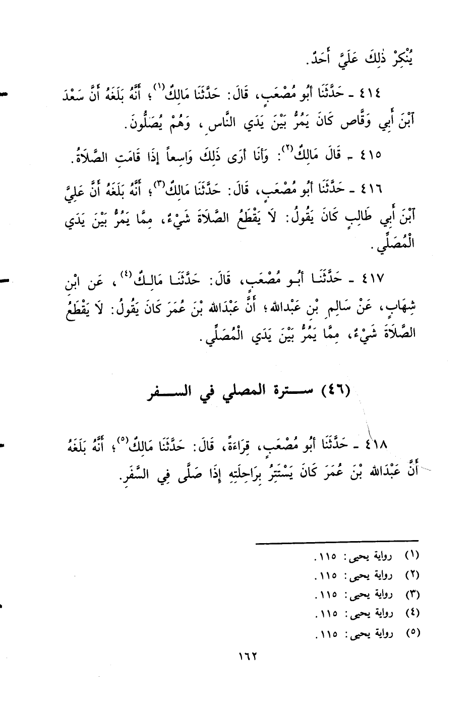 ٤١٤ - حَدَّثَنَا أَبُو مُصْعَبٍ، قَالَ: حَدَّثَنَا مَالِكٌ؛ أَنَّهُ بَلَغَهُ، أَنَّ سَعْدَ بْنَ أَبِي وَقَّاصٍ كَانَ يَمُرُّ بَيْنَ يَدَيْ الناس وهم يصلون.