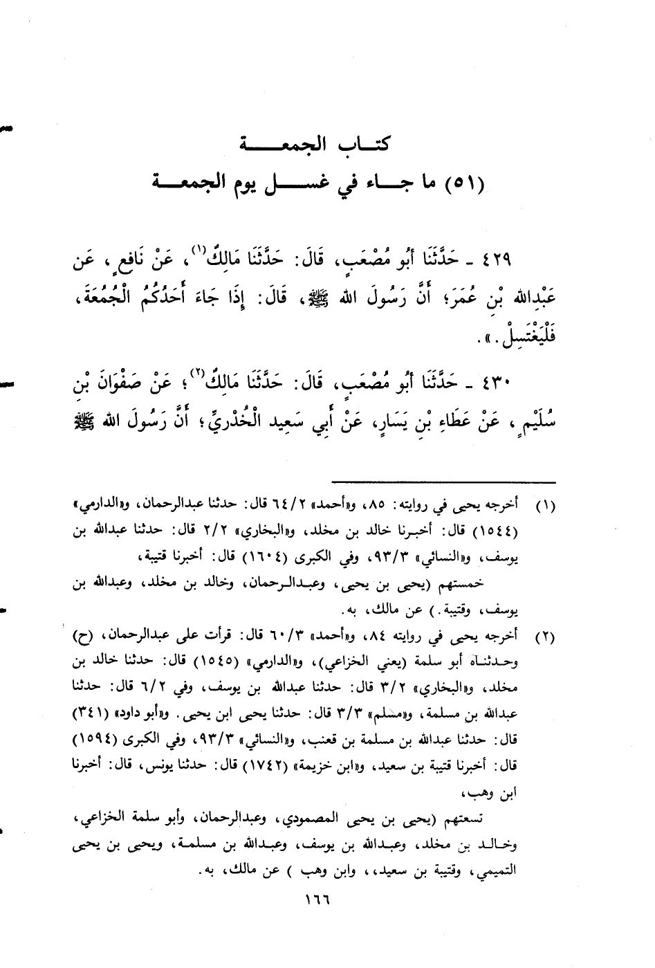 ٤٢٩ - حَدَّثَنَا أَبُو مُصْعَبٍ، قَالَ: حَدَّثَنَا مَالِكٌ، عَنْ نَافِعٍ، عَنْ عبد الله بْنِ عُمَرَ، أَنَّ رَسُولَ اللَّهِ صَلى الله عَلَيه وَسَلم، قَالَ: إِذَا جَاءَ أَحَدُكُمُ الْجُمُعَةَ فَلْيَغْتَسِلْ.