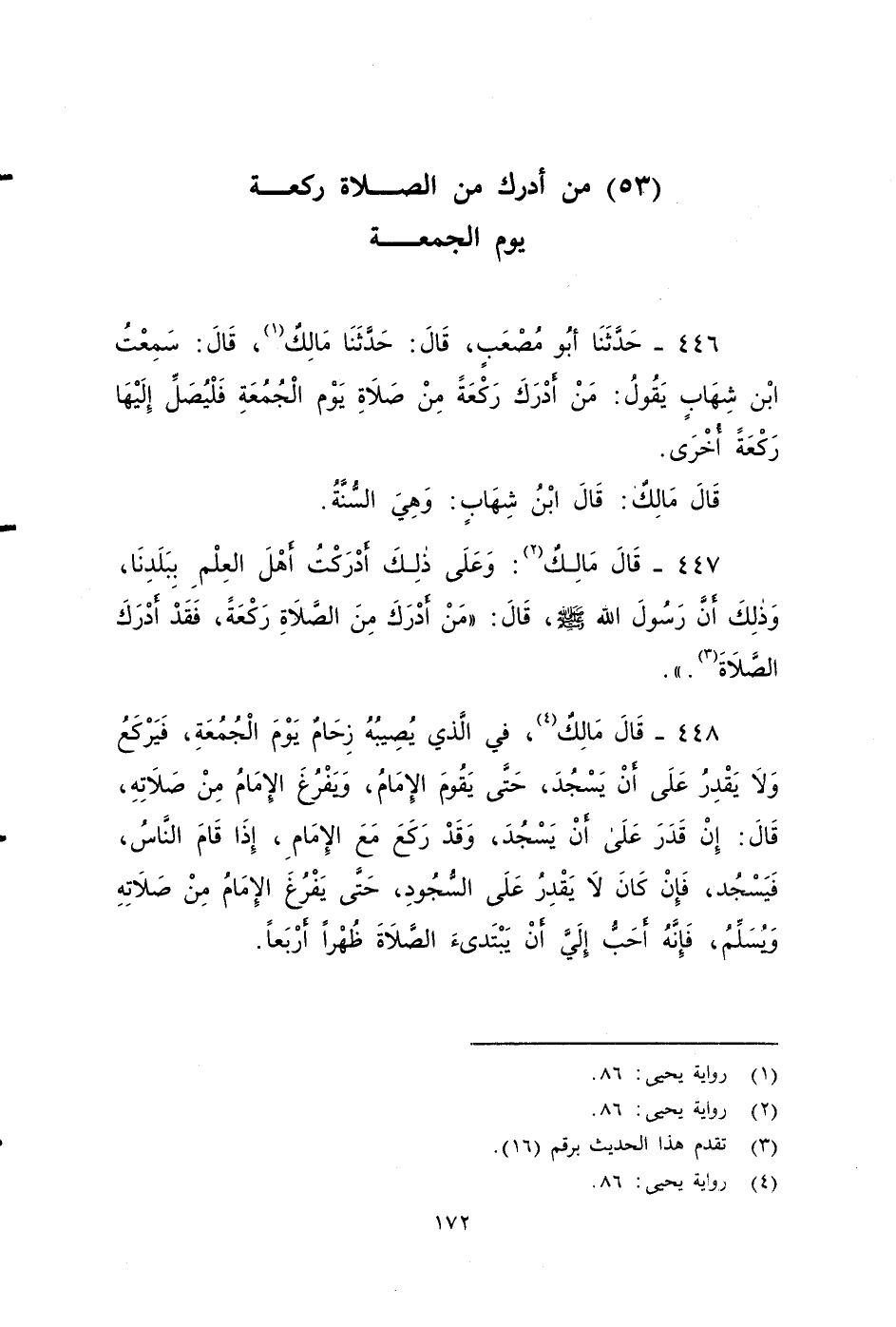 ٤٤٦ - حَدَّثَنَا أَبُو مُصْعَبٍ، قَالَ: حَدَّثَنَا مَالِكٌ ,قال سمعت ابْنَ شِهَابٍ يَقُولُ: مَنْ أَدْرَكَ رَكْعَةً مِنْ صَلَاةِ يوم الْجُمُعَةِ فَلْيُصَلِّ إِلَيْهَا أُخْرَى، قَالَ مَالِكٌ: قَالَ ابْنُ شِهَابٍ: وَهِيَ السُّنَّةُ.