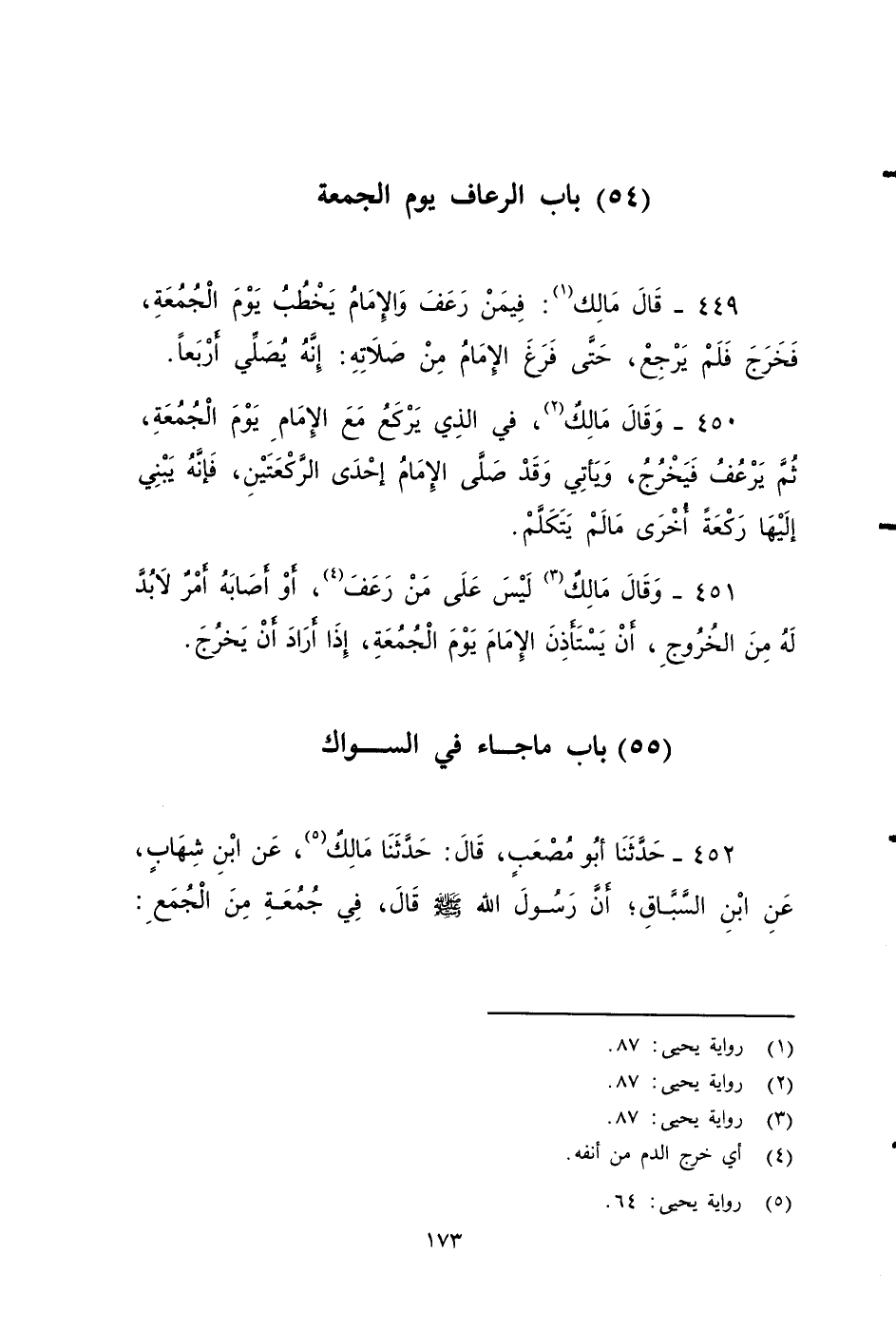٤٥١ - وقَالَ مَالِكٌ: لَيْسَ عَلَى مَنْ رَعَفَ، أَوْ أَصَابَهُ أَمْرٌ لَا بُدَّ لَهُ مِنَ الْخُرُوجِ أَنْ يَسْتَأْذِنَ الإِمَامَ يَوْمَ الْجُمُعَةِ، إِذَا أَرَادَ أَنْ يَخْرُجَ.