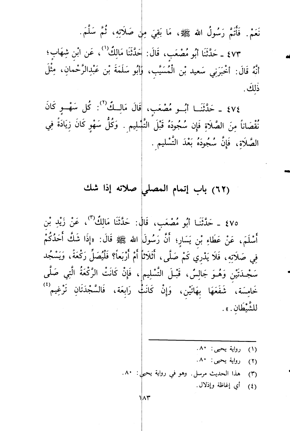 ٤٧٥ - حَدَّثَنَا أَبُو مُصْعَبٍ، قَالَ: حَدَّثَنَا مَالِكٌ، عَنْ زَيْدِ بْنِ أَسْلَمَ، عَنْ عَطَاءِ بْنِ يَسَارٍ، أَنَّ رَسُولَ اللَّهِ صَلى الله عَلَيه وَسَلم، قَالَ: إِذَا شَكَّ أَحَدُكُمْ فِي صَلَاتِهِ فَلَمْ يَدْرِ كَمْ صَلَّى، أَثَلَاثًا أَمْ أَرْبَعًا؟ فَلْيُصَلِّي رَكْعَةً، وَيَسْجُدْ سَجْدَتَيْنِ وَهُوَ جَالِسٌ قَبْلَ التَّسْلِيمِ، فَإِنْ كَانَتِ الرَّكْعَةُ الَّتِي صَلَّى خَامِسَةً: شَفَعَهَا بِهَاتَيْنِ، وَإِنْ كَانَتْ رَابِعَةً: فَالسَّجْدَتَانِ تَرْغِيمٌ لِلشَّيْطَانِ.