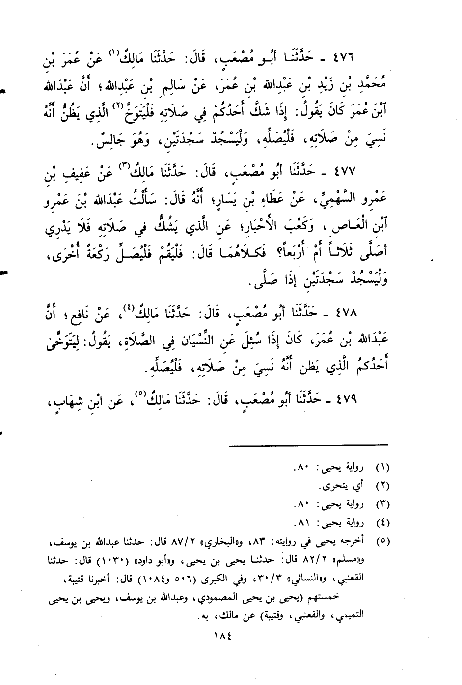 ٤٧٧ - حَدَّثَنَا أَبُو مُصْعَبٍ، قَالَ: حَدَّثَنَا مَالِكٌ، عَنْ عَفِيفِ بْنِ عَمْرٍو السَّهْمِيِّ , عَنْ عَطَاءِ بْنِ يَسَارٍ , أَنَّهُ قَالَ: سَأَلْتُ عَبْدَ اللهِ بْنَ عَمْرِو بْنِ الْعَاصِ , وَكَعْبَ الأََحْبَارِ عَنِ الَّذِي يَشُكُّ فِي صَلَاتِهِ فَلَا يَدْرِي أصَلَّى ثَلَاثًا أَمْ أَرْبَعًا؟ فَكِلَاهُمَا قَالَ: فليقم فلِيُصَلِّ رَكْعَةً أُخْرَى، لْيَسْجُدْ سَجْدَتَيْنِ إذا صلى.