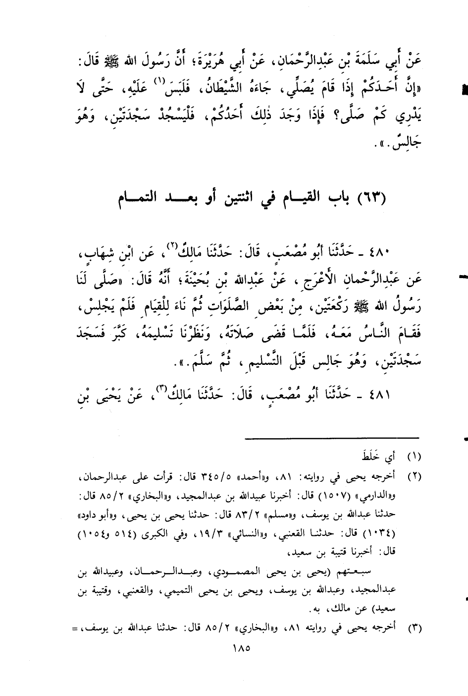٤٨٠ - حَدَّثَنَا أَبُو مُصْعَبٍ، قَالَ: حَدَّثَنَا مَالِكٌ، عَنِ ابْنِ شِهَابٍ، عَنْ عَبْدِ الرحمن الأَعْرَجِ، عَنْ عَبْدِ اللَّهِ بْنِ بُحَيْنَةَ، أَنَّهُ قَالَ: صَلَّى لَنَا رَسُولُ اللَّهِ صَلى الله عَلَيه وَسَلم رَكْعَتَيْنِ من بعض الصلوات، ثُمَّ نَاءَ لِلْقِيَامِ، فَلَمْ يَجْلِسْ، فَقَامَ النَّاسُ مَعَهُ، فَلَمَّا قَضَى صَلَاتَهُ وَنَظَرْنَا تَسْلِيمَهُ، كَبَّرَ فسَجَدَ سَجْدَتَيْنِ وَهُوَ جَالِسٌ قَبْلَ التَّسْلِيمِ، ثُمَّ سَلَّمَ.