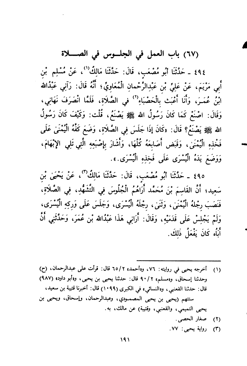 ٤٩٤ - حَدَّثَنَا أَبُو مُصْعَبٍ، قَالَ: حَدَّثَنَا مَالِكٌ، عَنْ مُسْلِمِ بْنِ أَبِي مَرْيَمَ، عَنْ عَلِيِّ بْنِ عَبْدِ الرَّحْمَنِ الْمُعَاوِيِّ، أَنَّهُ قَالَ: رَآنِي عَبْدُ اللَّهِ بْنُ عُمَرَ وَأَنَا أَعْبَثُ بِالْحَصْبَاءِ فِي الصَّلَاةِ، فَلَمَّا انْصَرَفْتُ نَهَانِي، وَقَالَ: اصْنَعْ كَمَا كَانَ رَسُولُ اللَّهِ صَلى الله عَلَيه وَسَلم يَصْنَعُ قُلْتُ: وَكَيْفَ كَانَ رَسُولُ اللَّهِ صَلى الله عَلَيه وَسَلم يَصْنَعُ؟ قَالَ: كَانَ إِذَا جَلَسَ فِي الصَّلَاةِ: وَضَعَ كَفَّهُ الْيُمْنَى عَلَى فَخِذِهِ الْيُمْنَى، وَقَبَضَ أَصَابِعَهُ كُلَّهَا، وَأَشَارَ بِأُصْبُعِهِ الَّتِي تَلِي الْإِبْهَامَ، وَوَضَعَ يده الْيُسْرَى عَلَى فَخِذِهِ الْيُسْرَى.