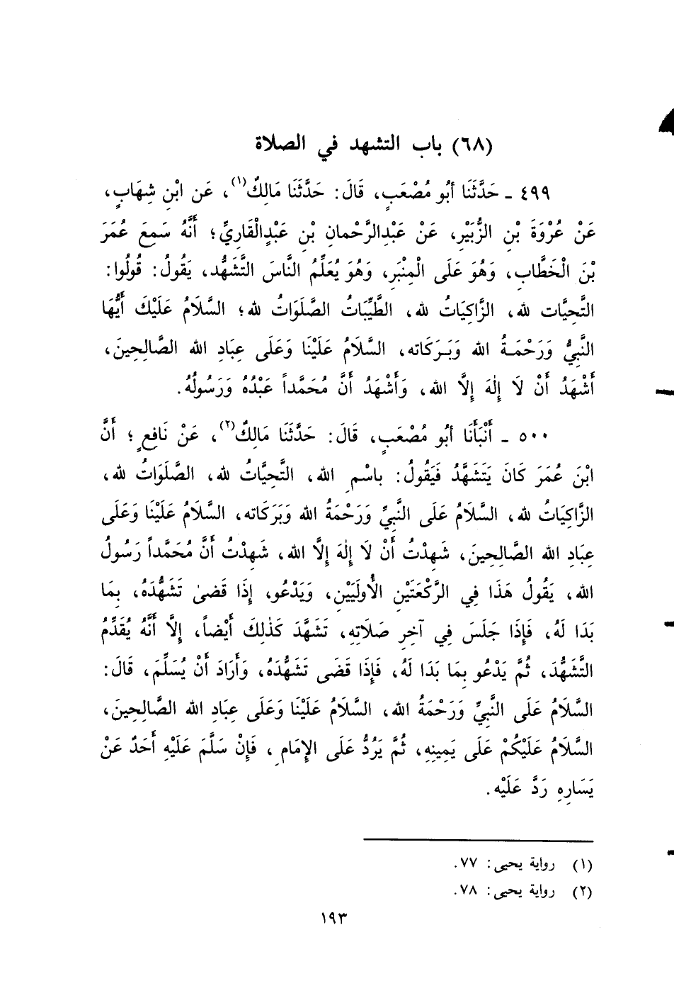 ٤٩٩ - حَدَّثَنَا أَبُو مُصْعَبٍ، قَالَ: حَدَّثَنَا مَالِكٌ، عَنِ ابْنِ شِهَابٍ، عَنْ عُرْوَةَ بْنِ الزُّبَيْرِ، عَنْ عَبْدِ الرَّحْمَنِ بْنِ عَبْدٍ الْقَارِيِّ، أَنَّهُ سَمِعَ عُمَرَ بْنَ الْخَطَّابِ وَهُوَ عَلَى الْمِنْبَرِ وهو يُعَلِّمُ النَّاسَ التَّشَهُّدَ، يَقُولُ: قُولُوا: التَّحِيَّاتُ لِلَّهِ، الزَّاكِيَاتُ لِلَّهِ، الطَّيِّبَاتُ الصَّلَوَاتُ لِلَّهِ، السَّلَامُ عَلَيْكَ أَيُّهَا النَّبِيُّ وَرَحْمَةُ اللهِ وَبَرَكَاتُهُ، السَّلَامُ عَلَيْنَا وَعَلَى عِبَادِ اللهِ الصَّالِحِينَ، أَشْهَدُ أَنْ لَا إِلَهَ إِلَاّ اللَّهُ، وَأَشْهَدُ أَنَّ مُحَمَّدًا عَبْدُهُ وَرَسُولُهُ.