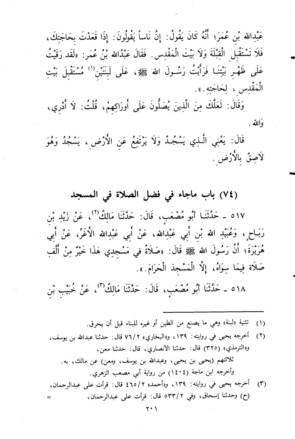 ٥١٦ - حَدَّثَنَا أَبُو مُصْعَبٍ، قَالَ: حَدَّثَنَا مَالِكٌ، عَنْ يَحْيَى بْنِ سَعِيدٍ، عَنْ مُحَمَّدِ بْنِ يَحْيَى بْنِ حَبَّانَ، عَنْ عَمِّهِ وَاسِعِ بْنِ حَبَّانَ، عَنْ عَبْدِ اللهِ بْنِ عُمَرَ، أَنَّهُ كَانَ يَقُولُ: إِنَّ نَاسًا يَقُولُونَ: إِذَا قَعَدْتَ بحَاجَتِكَ، فَلَا تَسْتَقْبِلِ الْقِبْلَةَ، وَلَا بَيْتَ الْمَقْدِسِ.