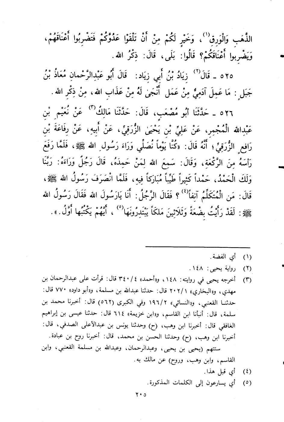 ٥٢٦ - حَدَّثَنَا أَبُو مُصْعَبٍ، قَالَ: حَدَّثَنَا مَالِكٌ، عَنْ نُعَيْمِ بْنِ عَبْدِ اللَّهِ الْمُجْمِرِ، عَنْ عَلِيِّ بْنِ يَحْيَى الزُّرَقِيِّ، عَنْ أَبِيهِ، عَنْ رِفَاعَةَ بْنِ رَافِعٍ الزرقي، أَنَّهُ قَالَ: كُنَّا يَوْمًا نُصَلِّي وَرَاءَ رَسُولِ اللَّهِ صَلى الله عَلَيه وَسَلم، فَلَمَّا رَفَعَ رَأْسَهُ مِنَ الرَّكْعَةِ، وَقَالَ: سَمِعَ اللَّهُ لِمَنْ حَمِدَهُ، قَالَ رَجُلٌ وَرَاءَهُ: رَبَّنَا وَلَكَ الْحَمْدُ، حَمْدًا كَثِيرًا طَيِّبًا مُبَارَكًا فِيهِ فَلَمَّا انْصَرَفَ رَسُولُ اللَّهِ صَلى الله عَلَيه وَسَلم، قَالَ: مَنِ الْمُتَكَلِّمُ آنِفًا، فَقَالَ الرَّجُلُ: أَنَا يَا رَسُولَ اللَّهِ فَقَالَ رَسُولُ اللَّهِ صَلى الله عَلَيه وَسَلم: لَقَدْ رَأَيْتُ بِضْعَةً وَثَلَاثِينَ مَلَكًا يَبْتَدِرُونَهَا أَيُّهُمْ يَكْتُبُهُا أَوَّلُ.