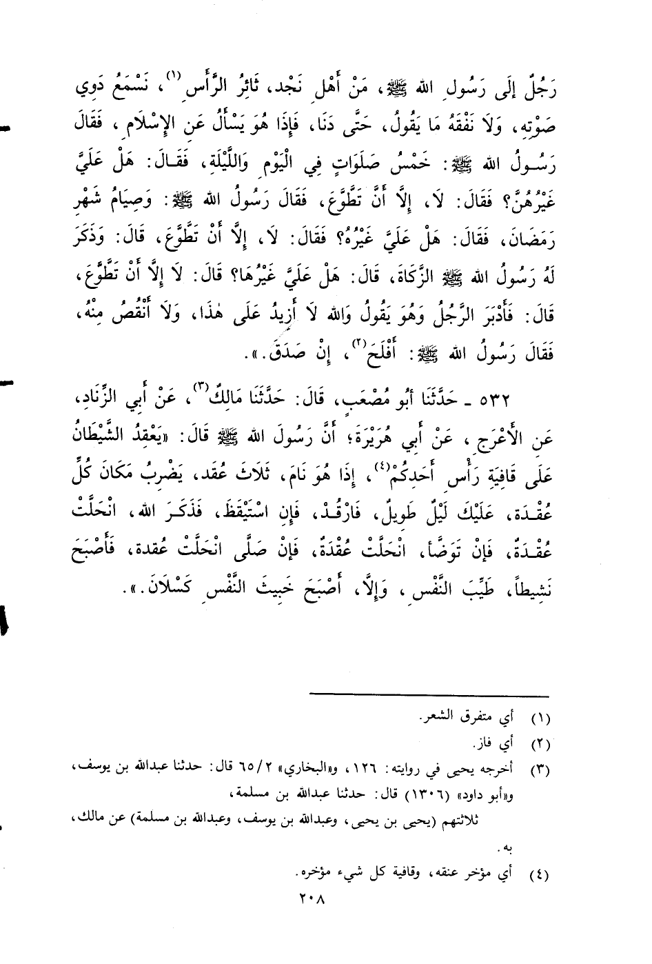 ٥٣٢ - حَدَّثَنَا أَبُو مُصْعَبٍ، قَالَ: حَدَّثَنَا مَالِكٌ، عَنْ أَبِي الزِّنَادِ، عَنِ الأَعْرَجِ، عَنْ أَبِي هُرَيْرَةَ، أَنَّ رَسُولَ اللَّهِ صَلى الله عَلَيه وَسَلم، قَالَ: يَعْقِدُ الشَّيْطَانُ عَلَى قَافِيَةِ رَأْسِ أَحَدِكُمْ إِذَا هُوَ نَامَ ثَلَاثَ عُقَدٍ، يَضْرِبُ مَكَانَ كُلِّ عُقْدَةٍ عَلَيْكَ لَيْلٌ طَوِيلٌ، فَارْقُدْ، فَإِنِ اسْتَيْقَظَ فَذَكَرَ اللَّهَ، انْحَلَّتْ عُقْدَةٌ، فَإِنْ تَوَضَّأَ انْحَلَّتْ عُقْدَةٌ، فَإِنْ صَلَّى انْحَلَّتْ عُقَدُهُ، فَأَصْبَحَ نَشِيطًا طَيِّبَ النَّفْسِ، وَإِلَّا أَصْبَحَ خَبِيثَ النَّفْسِ كَسْلَانَ.