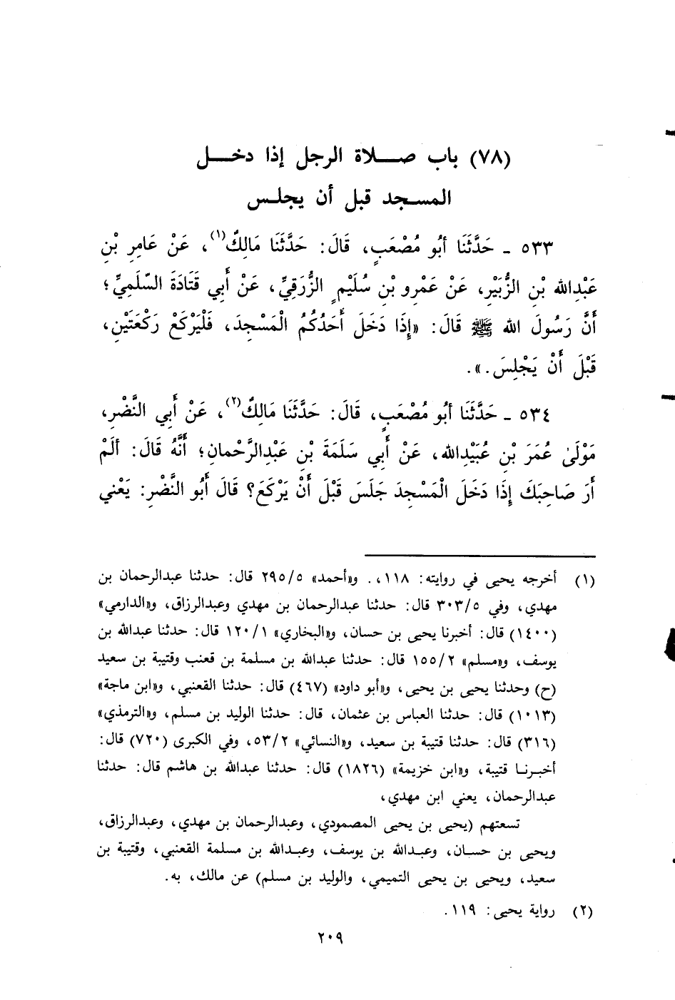 ٥٣٣ - حَدَّثَنَا أَبُو مُصْعَبٍ، قَالَ: حَدَّثَنَا مَالِكٌ، عَنْ عَامِرِ بْنِ عَبْدِ اللَّهِ بْنِ الزُّبَيْرِ، عَنْ عَمْرِو بْنِ سُلَيْمٍ الزُّرَقِيِّ، عَنْ أَبِي قَتَادَةَ الأَنْصَارِيِّ السلمي، أَنَّ رَسُولَ اللَّهِ صَلى الله عَلَيه وَسَلم، قَالَ: إِذَا دَخَلَ أَحَدُكُمْ الْمَسْجِدَ، فَلْيَرْكَعْ رَكْعَتَيْنِ قَبْلَ أَنْ يَجْلِسَ.