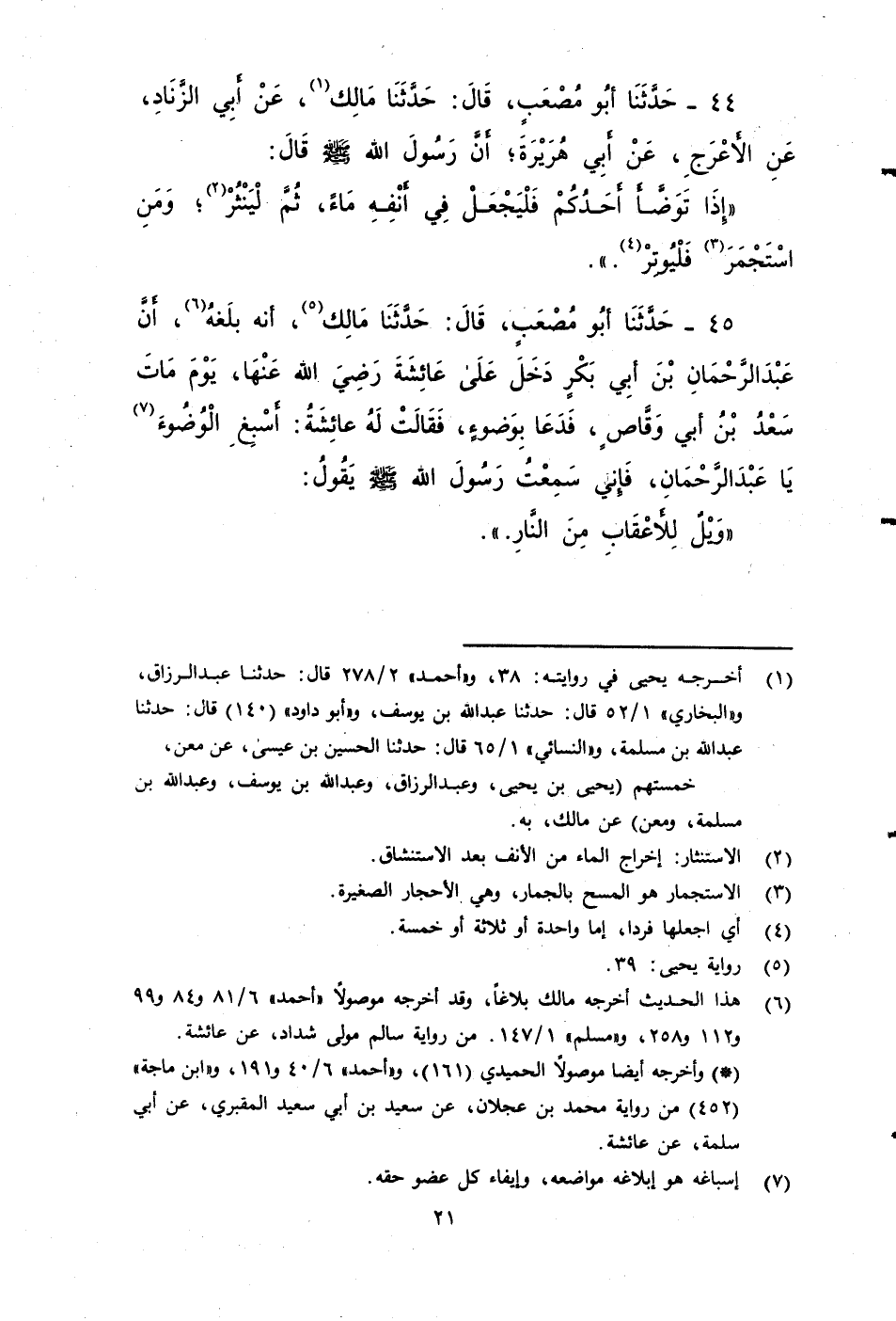 ٤٤ - حَدَّثَنَا أَبُو مُصْعَبٍ، قَالَ: حَدَّثَنَا مَالِكٌ، عَنْ أَبِي الزِّنَادِ، عَنْ الأَعْرَجِ، عَنْ أَبِي هُرَيْرَةَ، أَنَّ رَسُولَ اللَّهِ صَلى الله عَلَيه وَسَلم، قَالَ: إِذَا تَوَضَّأَ أَحَدُكُمْ فَلْيَجْعَلْ فِي أَنْفِهِ مَاءً ثُمَّ لِيَنْثِرْ، وَمَنِ اسْتَجْمَرَ فَلْيُوتِرْ.