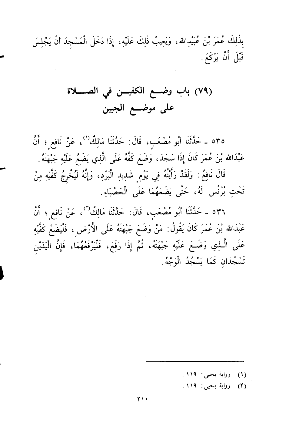 ٥٣٥ - حَدَّثَنَا أَبُو مُصْعَبٍ، قَالَ: حَدَّثَنَا مَالِكٌ، عَنْ نَافِعٍ، أَنَّ عَبْدَ اللهِ بْنَ عُمَرَ كَانَ إِذَا سَجَدَ، وَضَعَ كَفَّهِ عَلَى الَّذِي يَضَعُ عَلَيْهِ جْبهَتهُ.