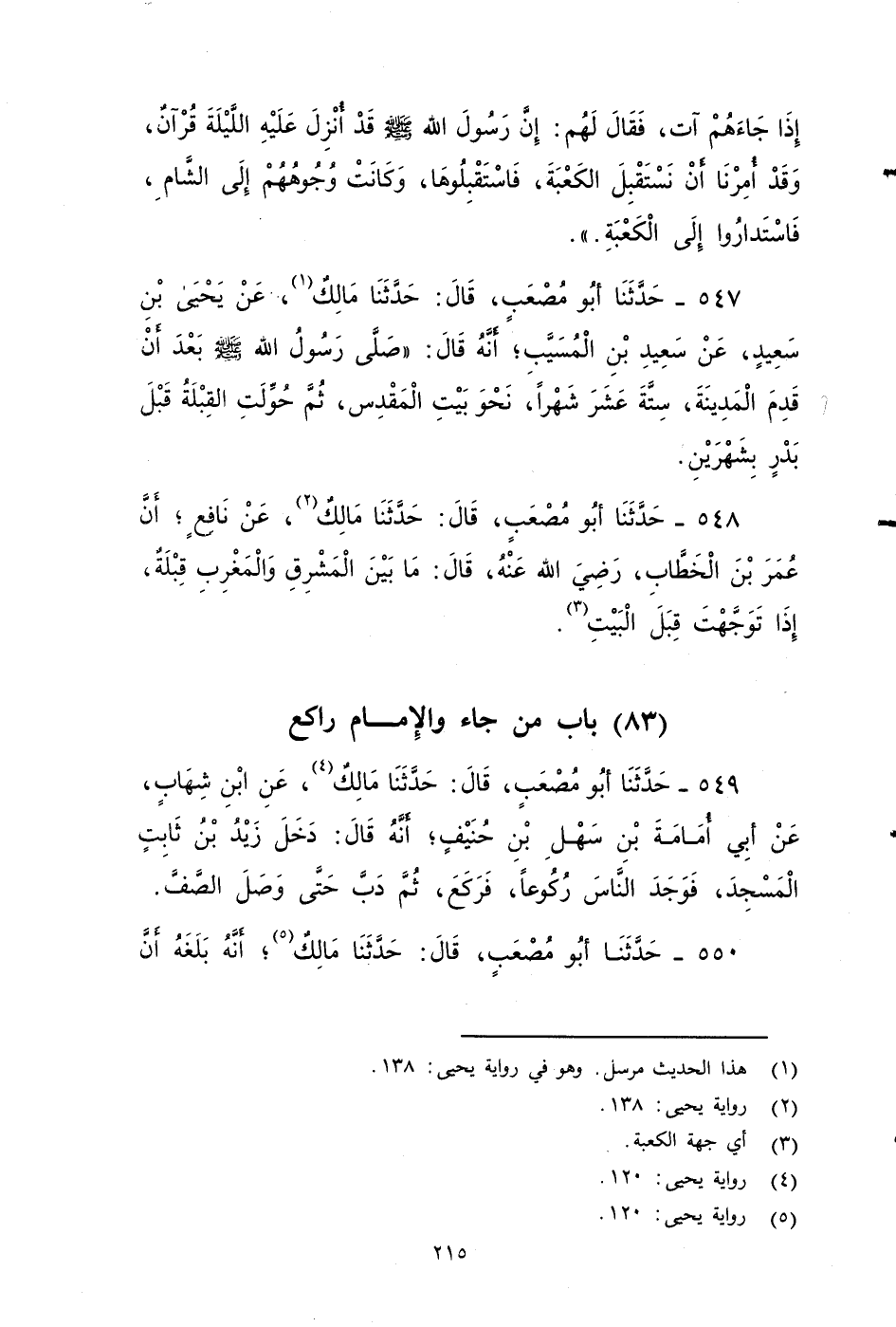 ٥٤٧ - حَدَّثَنَا أَبُو مُصْعَبٍ، قَالَ: حَدَّثَنَا مَالِكٌ، عَنْ يَحْيَى بْنِ سَعِيدٍ، عَنْ سَعِيدِ بْنِ الْمُسَيِّبِ، أَنَّهُ قَالَ: صَلَّى رَسُولُ اللَّهِ صَلى الله عَلَيه وَسَلم بَعْدَ أَنْ قَدِمَ الْمَدِينَةَ سِتَّةَ عَشَرَ شَهْرًا نَحْوَ بَيْتِ الْمَقْدِسِ، ثُمَّ حُوِّلَتِ الْقِبْلَةُ قَبْلَ بَدْرٍ بِشَهْرَيْنِ.