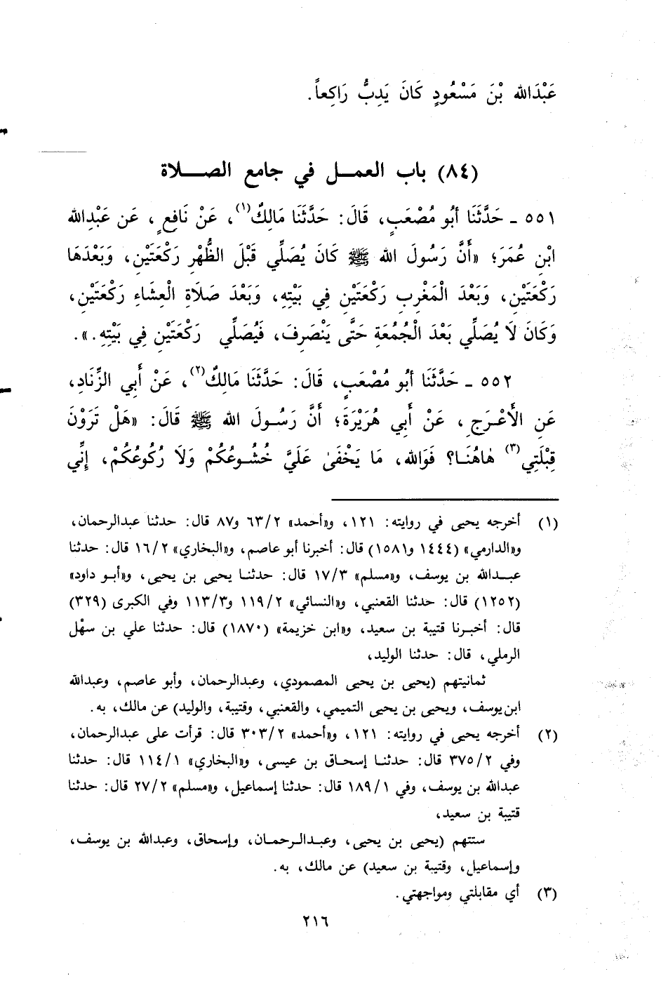 ٥٥١ - حَدَّثَنَا أَبُو مُصْعَبٍ، قَالَ: حَدَّثَنَا مَالِكٌ، عَنْ نَافِعٍ، عَنْ عبد الله بْنِ عُمَرَ، أَنَّ رَسُولَ اللَّهِ صَلى الله عَلَيه وَسَلم: كَانَ يُصَلِّي قَبْلَ الظُّهْرِ رَكْعَتَيْنِ، وَبَعْدَهَا رَكْعَتَيْنِ، وَبَعْدَ الْمَغْرِبِ رَكْعَتَيْنِ فِي بَيْتِهِ، وَبَعْدَ صَلَاةِ الْعِشَاءِ رَكْعَتَيْنِ، وَكَانَ لا يُصَلِّي بَعْدَ الْجُمُعَةِ حَتَّى يَنْصَرِفَ، فيصلي رَكْعَتَيْنِ في بيته.