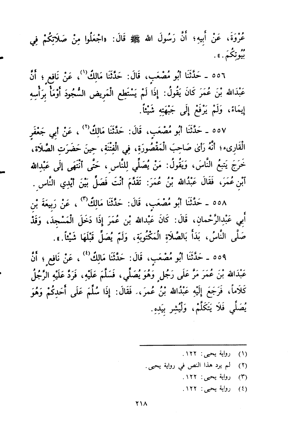 ٥٥٩ - حَدَّثَنَا أَبُو مُصْعَبٍ، قَالَ: حَدَّثَنَا مَالِكٌ، عَنْ نَافِعٍ، أَنَّ عَبْدَ اللهِ بْنَ عُمَرَ مَرَّ عَلَى رَجُلٍ وَهُوَ يُصَلِّي، فَسَلَّمَ عَلَيْهِ، فَرَدَّ عليه الرَّجُلُ كَلَامًا، فَرَجَعَ إِلَيْهِ عَبْدُ اللهِ بْنُ عُمَرَ فَقَالَ: إِذَا سُلِّمَ عَلَى أَحَدِكُمْ وَهُوَ يُصَلِّي فَلَا يَتَكَلَّمْ، وَلْيُشِرْ بِيَدِهِ.