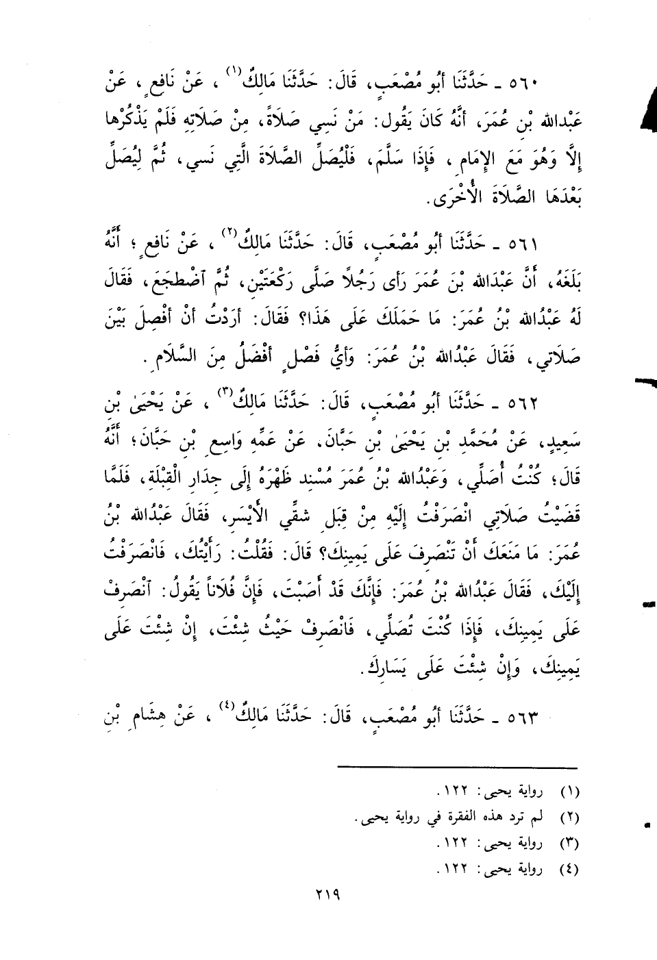 ٥٦٢ - حَدَّثَنَا أَبُو مُصْعَبٍ، قَالَ: حَدَّثَنَا مَالِكٌ، عَنْ يَحْيَى بْنِ سَعِيدٍ، عَنْ مُحَمَّدِ بْنِ يَحْيَى بْنِ حَبَّانَ , عَنْ عَمِّهِ وَاسِعِ بْنِ حَبَّانَ أَنَّهُ قَالَ: كُنْتُ أُصَلِّي وَعَبْدُ اللهِ بْنُ عُمَرَ مُسْنِدٌ ظَهْرَهُ إِلَى جِدَارِ الْقِبْلَةِ، فَلَمَّا قَضَيْتُ صَلَاتِي انْصَرَفْتُ إِلَيْهِ مِنْ قِبَلِ شِقِّي الأََيْسَرِ، فَقَالَ عَبْدُ اللهِ بْنُ عُمَرَ: مَا مَنَعَكَ أَنْ تَنْصَرِفَ عَلى يَمِينِكَ؟ قَالَ: فَقُلْتُ: رَأَيْتُكَ، فَانْصَرَفْتُ إِلَيْكَ، فقَالَ عَبْدُ اللهِ بن عمر: فَإِنَّكَ قَدْ أَصَبْتَ، فإِنَّ فلانا يَقُولُ: انْصَرِفْ عَلَى يَمِينِكَ، فَإِذَا كُنْتَ تُصَلِّي، فَانْصَرِفْ حَيْثُ شِئْتَ، إِنْ شِئْتَ عَلَى يَمِينِكَ، وَإِنْ شِئْتَ عَلَى يَسَارِكَ.