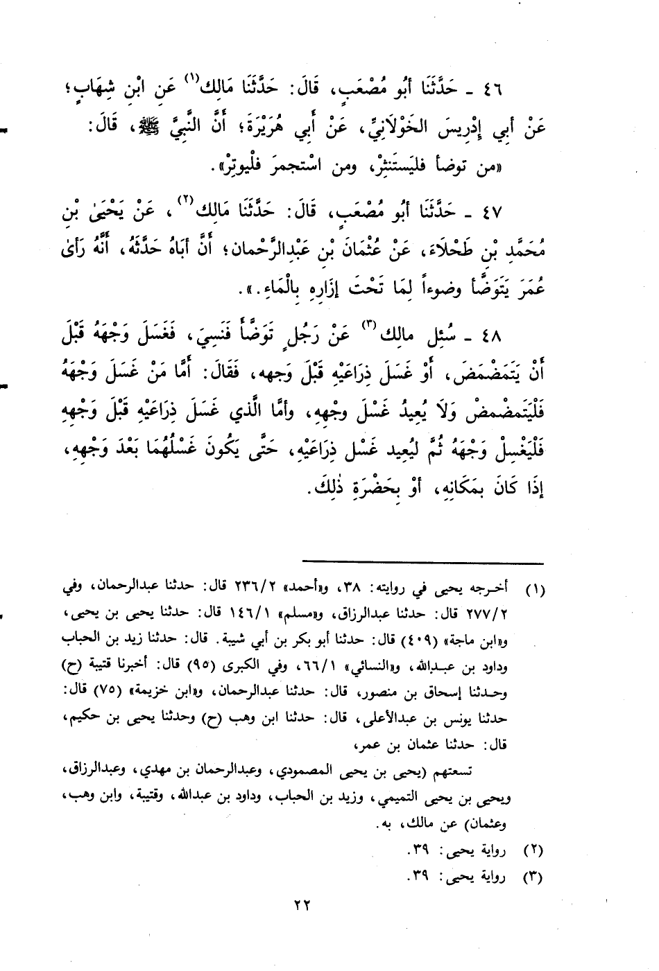 ٤٧ - حَدَّثَنَا أَبُو مُصْعَبٍ، قَالَ: حَدَّثَنَا مَالِكٌ، عَنْ يَحْيَى بْنِ مُحَمَّدِ بْنِ طَحْلَاءَ , عَنْ عُثْمَانَ بْنِ عَبْدِ الرَّحْمَنِ , أَنَّ أَبَاهُ حَدَّثَهُ , أَنَّهُ رأى عُمَرَ يَتَوَضَّأُ وُضُوءًا لِمَا تَحْتَ إِزَارِهِ بِالْمَاءِ.
