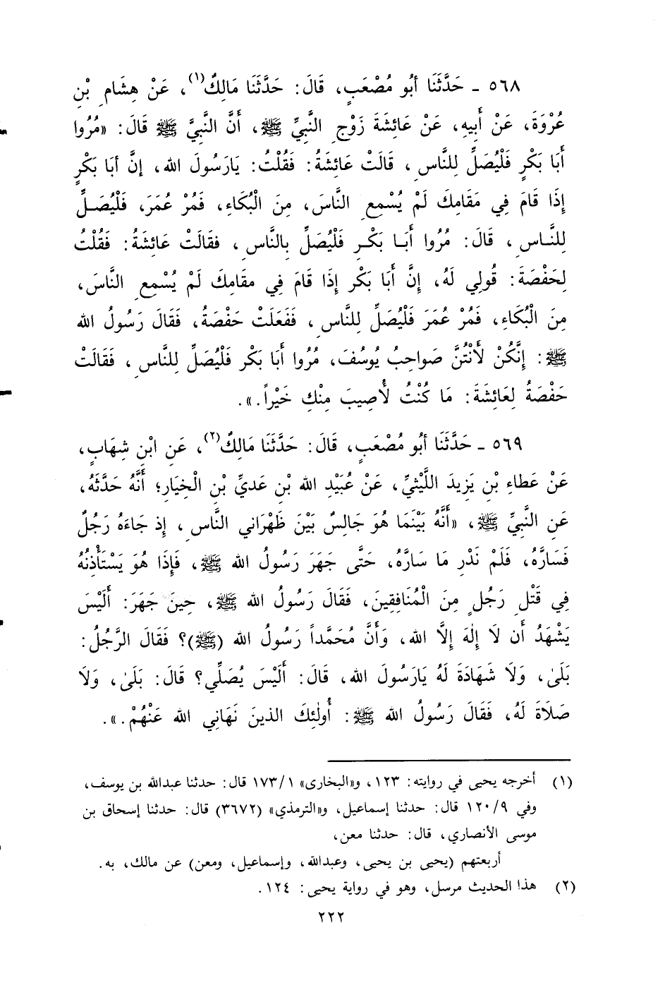 ٥٦٨ - حَدَّثَنَا أَبُو مُصْعَبٍ، قَالَ: حَدَّثَنَا مَالِكٌ، عَنْ هِشَامِ بْنِ عُرْوَةَ، عَنْ أَبِيهِ، عَنْ عَائِشَةَ زَوْجِ النَّبِيِّ صَلى الله عَلَيه وَسَلم، أَنَّ النبي صَلى الله عَلَيه وَسَلم، قَالَ: مُرُوا أَبَا بَكْرٍ فَلْيُصَلِّ لِلنَّاسِ قَالَتْ عَائِشَةُ: فقلت يَا رَسُولَ اللَّهِ، إِنَّ أَبَا بَكْرٍ إِذَا قَامَ فِي مَقَامِكَ لَمْ يُسْمِعِ النَّاسَ مِنَ الْبُكَاءِ، فَمُرْ عُمَرَ فَلْيُصَلِّ لِلنَّاسِ، قَالَ: مُرُوا أَبَا بَكْرٍ فَلْيُصَلِّ بالنَّاسِ، فقَالَتْ عَائِشَةُ: فَقُلْتُ لِحَفْصَةَ: قُولِي لَهُ إِنَّ أَبَا بَكْرٍ إِذَا قَامَ فِي مَقَامِكَ لَمْ يُسْمِعِ النَّاسَ مِنَ الْبُكَاءِ، فَمُرْ عُمَرَ فَلْيُصَلِّ لِلنَّاسِ، فَفَعَلَتْ حَفْصَةُ فَقَالَ رَسُولُ اللَّهِ صَلى الله عَلَيه وَسَلم: إِنَّكُنَّ لَأَنْتُنَّ صَوَاحِبُ يُوسُفَ، مُرُوا أَبَا بَكْرٍ فَلْيُصَلِّ لِلنَّاسِ، فَقَالَتْ حَفْصَةُ لِعَائِشَةَ: مَا كُنْتُ لِأُصِيبَ مِنْكِ خَيْرًا.