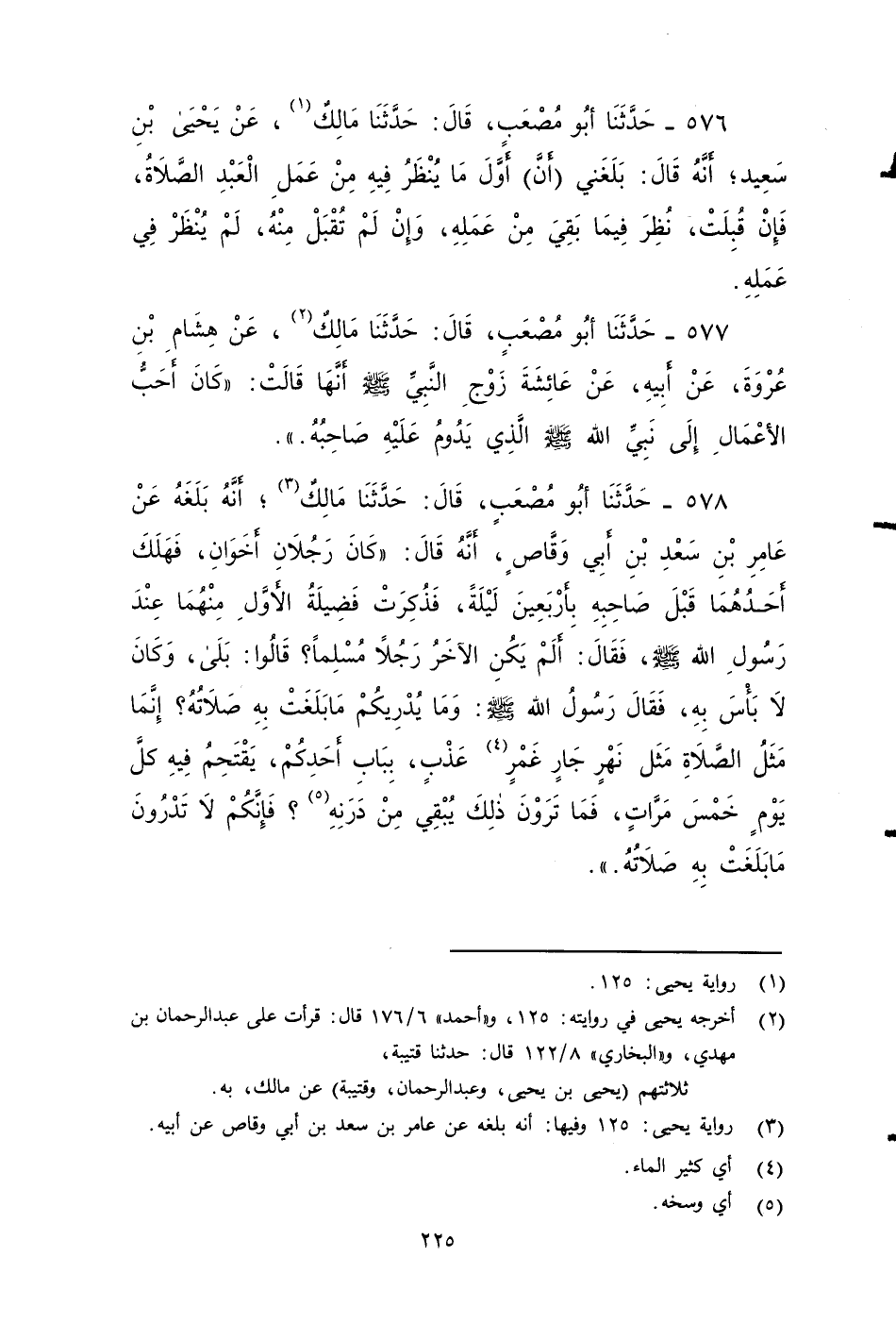 ٥٧٦ - حَدَّثَنَا أَبُو مُصْعَبٍ، قَالَ: حَدَّثَنَا مَالِكٌ، عَنْ يَحْيَى بْنِ سَعِيدٍ، أَنَّهُ قَالَ: بَلَغَنِي أَنَّ أَوَّلَ مَا يُنْظَرُ فِيهِ مِنْ عَمَلِ الْعَبْدِ الصَّلَاةُ، فَإِنْ قُبِلَتْ، نُظِرَ فِيمَا بَقِيَ مِنْ عَمَلِهِ، وَإِنْ لَمْ تُقْبَلْ مِنْهُ، لَمْ يُنْظَرْ فِي عَمَلِهِ.