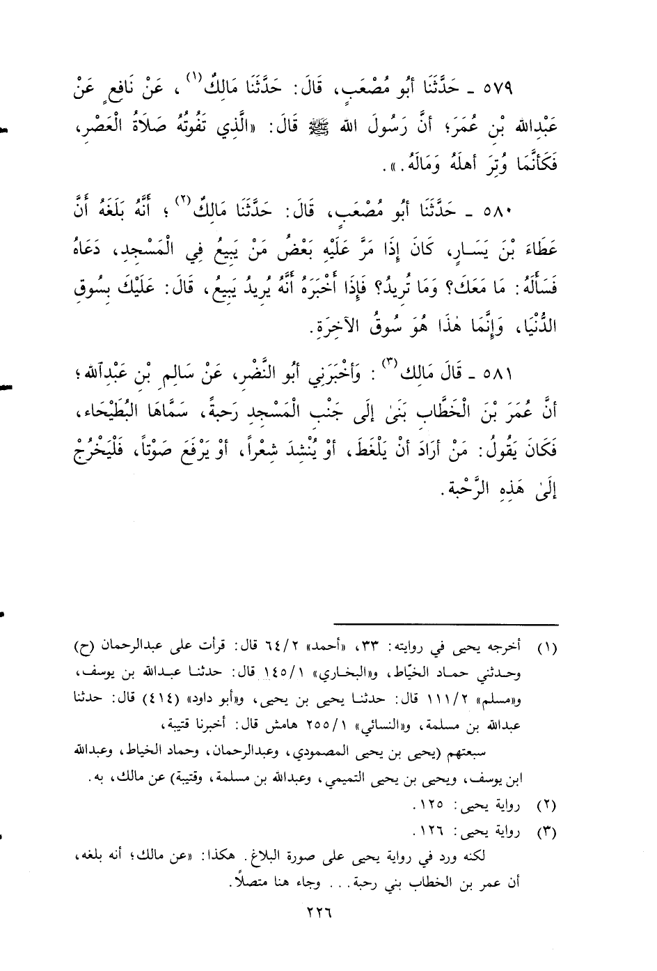 ٥٧٩ - حَدَّثَنَا أَبُو مُصْعَبٍ، قَالَ: حَدَّثَنَا مَالِكٌ، عَنْ نَافِعٍ، عَنْ عَبْدِ اللَّهِ بْنِ عُمَرَ، أَنَّ رَسُولَ اللَّهِ صَلى الله عَلَيه وَسَلم، قَالَ: الَّذِي تَفُوتُهُ صَلَاةُ الْعَصْرِ: فكَأَنَّمَا وُتِرَ أَهْلَهُ وَمَالَهُ.