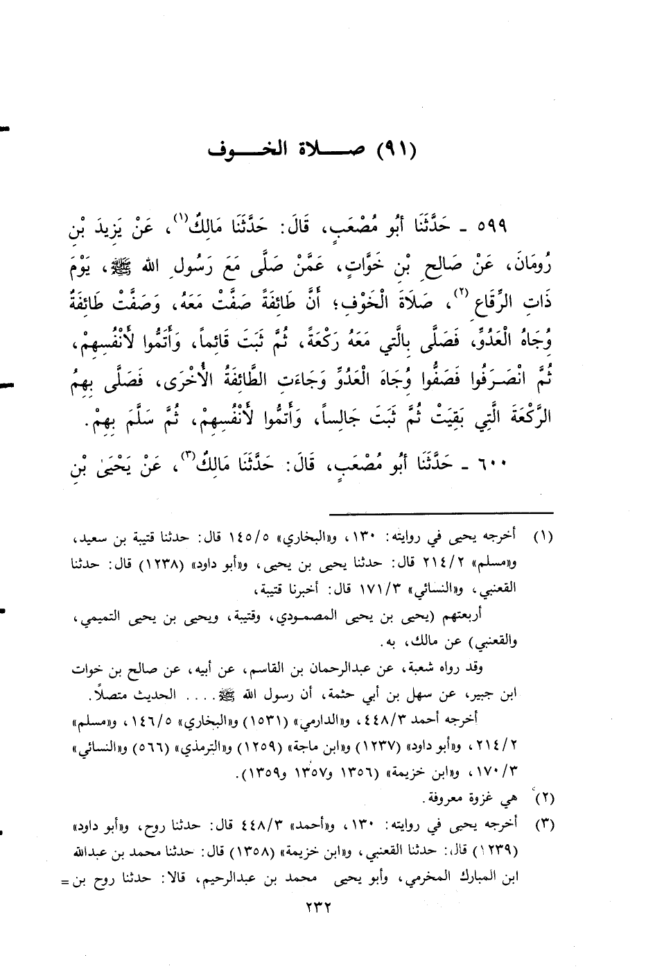 ٥٩٩ - حَدَّثَنَا أَبُو مُصْعَبٍ، قَالَ: حَدَّثَنَا مَالِكٌ، عَنْ يَزِيدَ بْنِ رُومَانَ، عَنْ صَالِحِ بْنِ خَوَّاتٍ، عَمَّنْ صَلَّى مَعَ رَسُولِ اللَّهِ صَلى الله عَلَيه وَسَلم يَوْمَ ذَاتِ الرِّقَاعِ صَلَاةَ الْخَوْفِ، أَنَّ طَائِفَةً صَفَّتْ مَعَهُ وَصَفَّتْ طَائِفَةٌ وِجَاهَ الْعَدُوِّ، فَصَلَّى بِالَّتِي مَعَهُ رَكْعَةً، ثُمَّ ثَبَتَ قَائِمًا، وَأَتَمُّوا لِأَنْفُسِهِمْ، ثُمَّ انْصَرَفُوا فَصَفُّوا، وِجَاهَ الْعَدُوِّ، وَجَاءَتِ الطَّائِفَةُ الْأُخْرَى، فَصَلَّى بِهِمُ الرَّكْعَةَ الَّتِي بَقِيَتْ مِنْ صَلاتِهِ، ثُمَّ ثَبَتَ جَالِسًا، وَأَتَمُّوا لِأَنْفُسِهِمْ، ثُمَّ سَلَّمَ بِهِمْ.