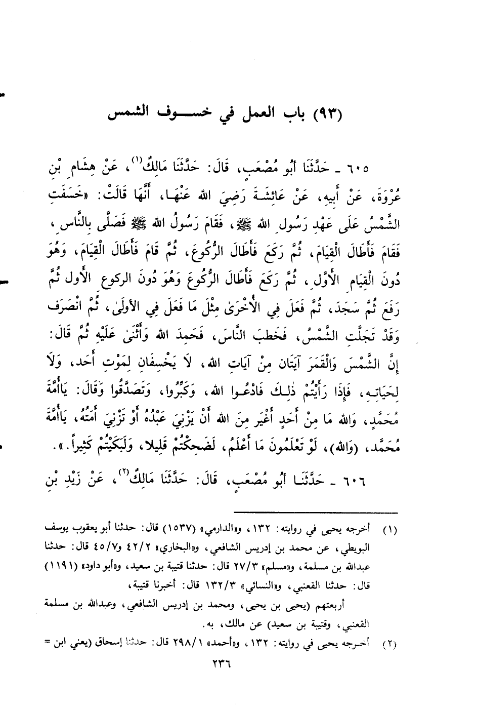 ٦٠٥ - حَدَّثَنَا أَبُو مُصْعَبٍ، قَالَ: حَدَّثَنَا مَالِكٌ، عَنْ هِشَامِ بْنِ عُرْوَةَ، عَنْ أَبِيهِ، عَنْ عَائِشَةَ رَضِيَ اللَّهُ عَنْهَا، أَنَّهَا قَالَتْ: خَسَفَتِ الشَّمْسُ على عَهْدِ رَسُولِ اللَّهِ صَلى الله عَلَيه وَسَلم، فَصَلَّى فقام رَسُولُ اللَّهِ صَلى الله عَلَيه وَسَلم، فصلى بِالنَّاسِ، فَقَامَ فَأَطَالَ الْقِيَامَ، ثُمَّ رَكَعَ فَأَطَالَ الرُّكُوعَ، ثُمَّ قَامَ فَأَطَالَ الْقِيَامَ، وَهُوَ دُونَ الْقِيَامِ الأَوَّلِ، ثُمَّ رَكَعَ فَأَطَالَ الرُّكُوعَ وَهُوَ دُونَ الرُّكُوعِ الأَوَّلِ، ثُمَّ رَفَعَ، فَسَجَدَ، ثُمَّ فَعَلَ فِي الْآخِرَى مِثْلَ ما فعل في الأولى، ثُمَّ انْصَرَفَ، وَقَدْ تَجَلَّتِ الشَّمْسُ، فَخَطَبَ النَّاسَ: فَحَمِدَ اللَّهَ وَأَثْنَى عَلَيْهِ، ثُمَّ قَالَ: إِنَّ الشَّمْسَ وَالْقَمَرَ آيَتَانِ مِنْ آيَاتِ اللَّهِ، لا يَخْسِفَانِ لِمَوْتِ أَحَدٍ، وَلَا لِحَيَاتِهِ، فَإِذَا رَأَيْتُمْ ذَلِكَ فَادْعُوا اللَّهَ، وَكَبِّرُوا، وَتَصَدَّقُوا، وقَالَ: يَا أُمَّةَ مُحَمَّدٍ: وَاللَّهِ مَا مِنْ أَحَدٍ أَغْيَرَ مِنَ اللَّهِ أَنْ يَزْنِيَ عَبْدُهُ أَوْ تَزْنِيَ أَمَتُهُ، يَا أُمَّةَ مُحَمَّدٍ: وَاللَّهِ لَوْ تَعْلَمُونَ مَا أَعْلَمُ، لَضَحِكْتُمْ قَلِيلًا وَلَبَكَيْتُمْ كَثِيرًا.