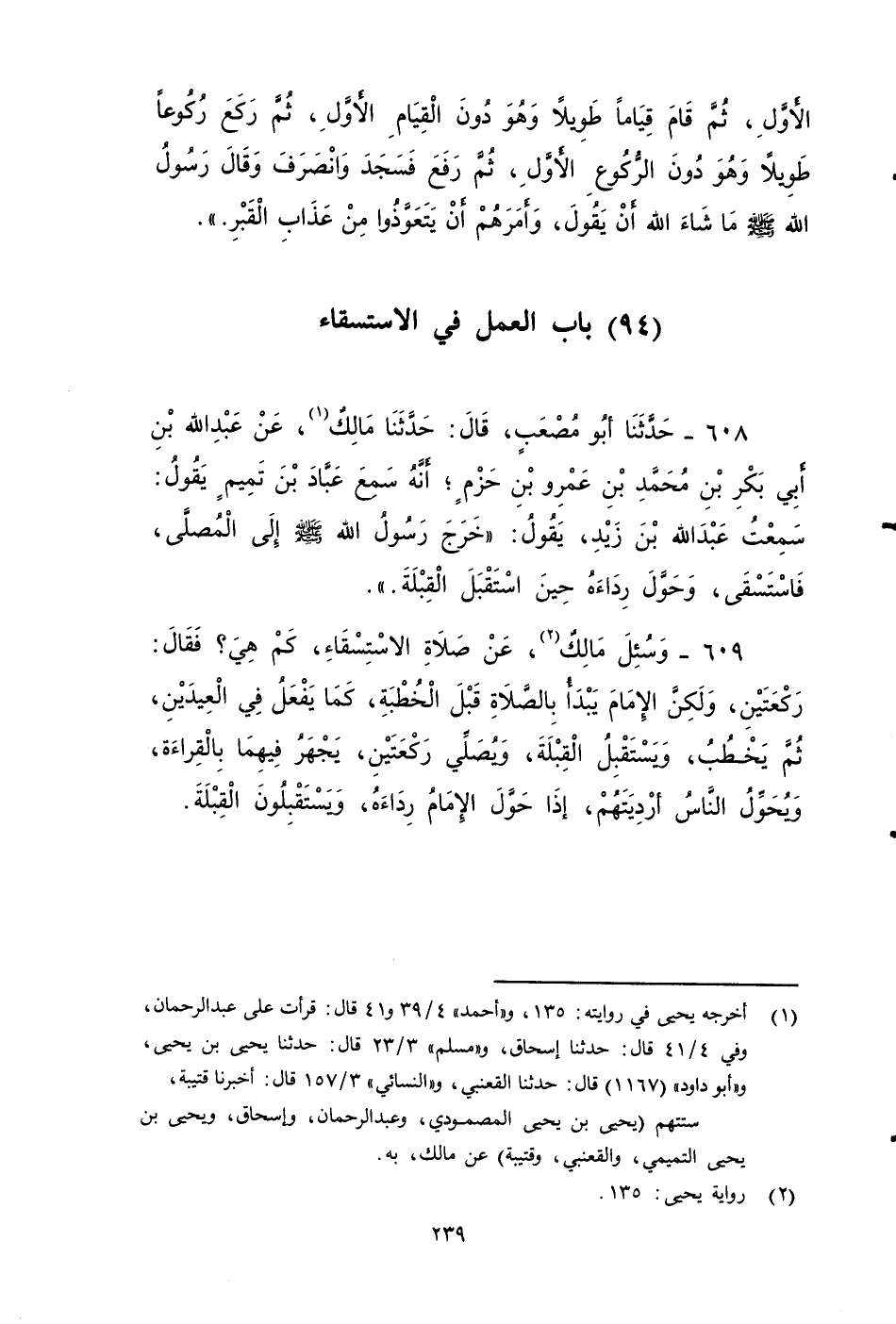 ٦٠٨ - حَدَّثَنَا أَبُو مُصْعَبٍ، قَالَ: حَدَّثَنَا مَالِكٌ، عَنْ عَبْدِ اللَّهِ بْنِ أَبِي بَكْرِ بن محمد بْنِ عَمْرِو بْنِ حَزْمٍ، أَنَّهُ سَمِعَ عَبَّادَ بْنَ تَمِيمٍ، يَقُولُ: سَمِعْتُ عَبْدَ اللَّهِ بْنَ زَيْدٍ، يَقُولُ: خَرَجَ رَسُولُ اللَّهِ صَلى الله عَلَيه وَسَلم إِلَى الْمُصَلَّى فَاسْتَسْقَى، وَحَوَّلَ رِدَاءَهُ حِينَ اسْتَقْبَلَ الْقِبْلَةَ.