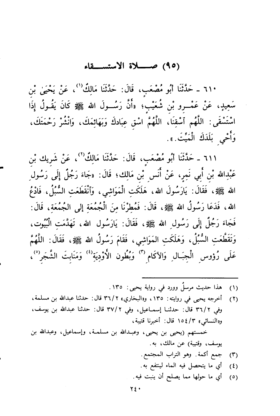 ٦١١ - حَدَّثَنَا أَبُو مُصْعَبٍ، قَالَ: حَدَّثَنَا مَالِكٌ، عَنْ شَرِيكِ بْنِ عَبْدِ اللَّهِ بْنِ أَبِي نَمِرٍ، عَنْ أَنَسِ بْنِ مَالِكٍ، قَالَ: جَاءَ رَجُلٌ إِلَى رَسُولِ اللَّهِ صَلى الله عَلَيه وَسَلم، فَقَالَ: يَا رَسُولَ اللَّهِ، هَلَكَتِ الْمَوَاشِي، وَانَقَطَّعَتِ السُّبُلُ، فَادْعُ اللَّهَ فَدَعَا رَسُولُ اللَّهِ صَلى الله عَلَيه وَسَلم، قال: فَمُطِرْنَا مِنَ الْجُمُعَةِ إِلَى الْجُمُعَةِ، قَالَ: فَجَاءَ الرَجُلٌ إِلَى رَسُولِ اللَّهِ صَلى الله عَلَيه وَسَلم، فَقَالَ: يَا رَسُولَ اللَّهِ، تَهَدَّمَتِ الْبُيُوتُ، وَتقَطَعَتِ السُّبُلُ، وَهَلَكَتِ الْمَوَاشِي، فَقَام رَسُولُ اللَّهِ صَلى الله عَلَيه وَسَلم، فقال: اللَّهُمَّ على رؤوس الْجِبَالِ، وَالْآكَامِ، وَبُطُونَ الأَوْدِيَةِ، وَمَنَابِتِ الشَّجَرِ، فَانْجَابَتْ عَنِ الْمَدِينَةِ انْجِيَابَ الثَّوْبِ.