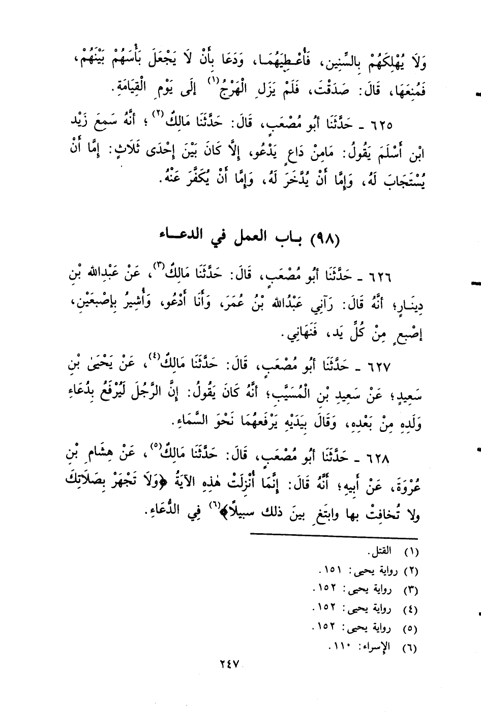 ٦٢٨ - حَدَّثَنَا أَبُو مُصْعَبٍ، قَالَ: حَدَّثَنَا مَالِكٌ، عَنْ هِشَامِ بْنِ عُرْوَةَ، عَنْ أَبِيهِ , أَنَّهُ قَالَ: إِنَّمَا أُنْزِلَتْ هَذِهِ الآيَةُ: {وَلَا تَجْهَرْ بِصَلَاتِكَ وَلَا تُخَافِتْ بِهَا وَابْتَغِ بَيْنَ ذَلِكَ سَبِيلاً} ، فِي الدُّعَاءِ.....