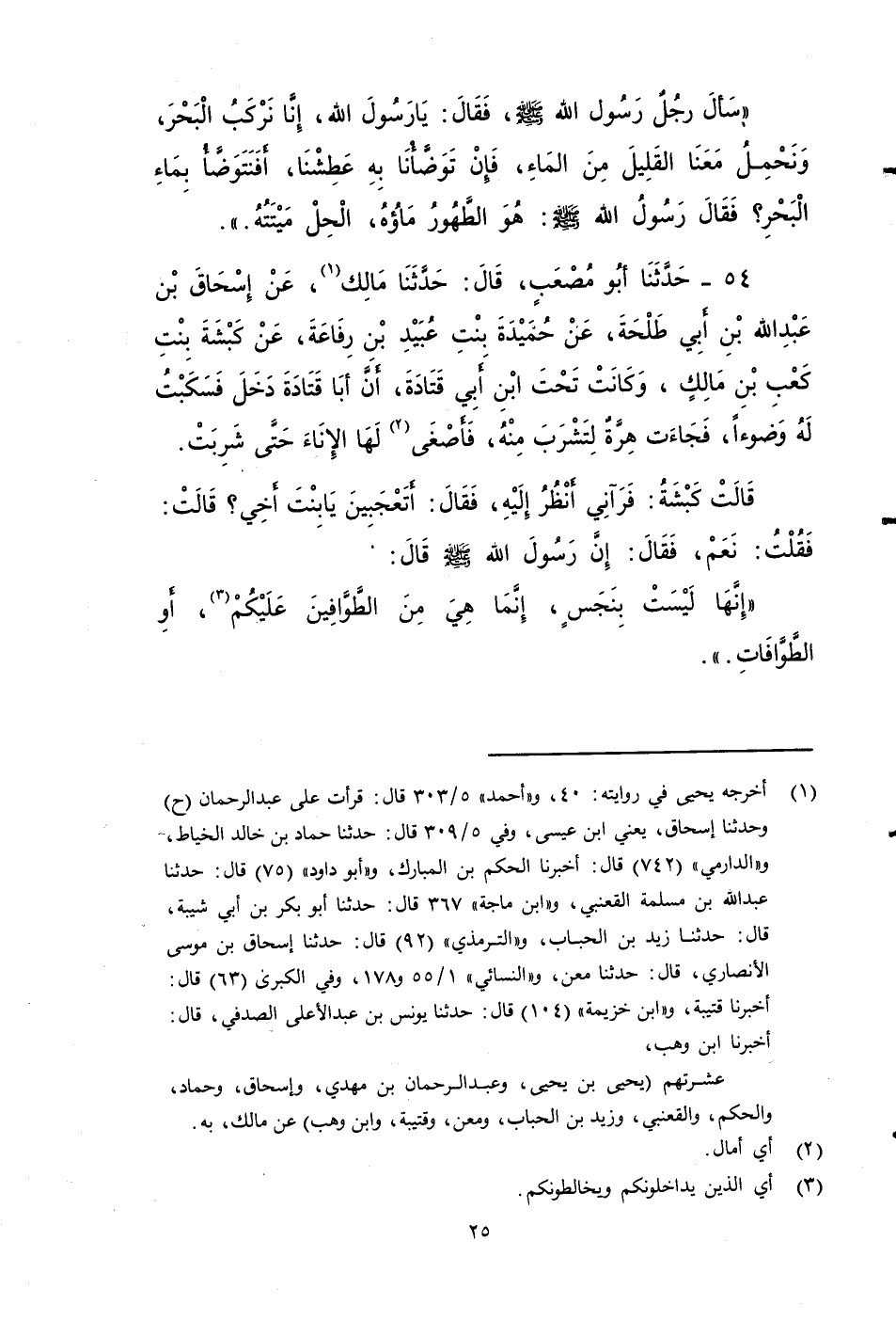 قَالَتْ كَبْشَةُ: فَرَآنِي أَنْظُرُ إِلَيْهِ: فَقَالَ: أَتَعْجَبِينَ يَابْنَت أَخِي، قَالَتْ: فَقُلْتُ: نَعَمْ فَقَالَ: إِنَّ رَسُولَ اللَّهِ صَلى الله عَلَيه وَسَلم، قَالَ: إِنَّهَا لَيْسَتْ بِنَجَسٍ، إِنَّمَا هِيَ مِنَ الطَّوَّافِينَ عَلَيْكُمْ، أَوِ الطَّوَّافَاتِ.
