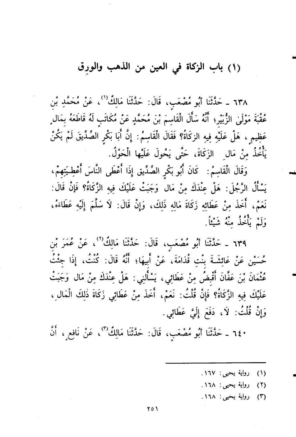 ٦٣٨ - حَدَّثَنَا أَبُو مُصْعَبٍ، قَالَ: حَدَّثَنَا مَالِكٌ، عَنْ مُحَمَّدِ بْنِ عُقْبَةَ , مَوْلَى الزُّبَيْرِ، أَنَّهُ سَأَلَ الْقَاسِمَ بْنَ مُحَمَّدٍ عَنْ مُكَاتَبٍ لَهُ , قَاطَعَهُ بِمَالٍ عَظِيمٍ، هَلْ عَلَيْهِ فِيهِ الزَكَاةٌ؟ فَقَالَ الْقَاسِمُ: إِنَّ أَبَا بَكْرٍ الصِّدِّيقَ لَمْ يَكُنْ يَأْخُذُ مِنْ مَالٍ زَكَاةً , حَتَّى يَحُولَ عَلَيْهِا الْحَوْلُ.