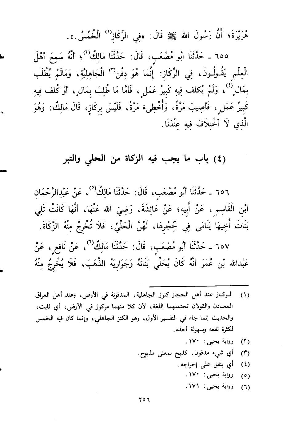 ٦٥٦ - حَدَّثَنَا أَبُو مُصْعَبٍ، قَالَ: حَدَّثَنَا مَالِكٌ، عَنْ عَبْدِ الرَّحْمَنِ بْنِ الْقَاسِمِ، عَنْ أَبِيهِ، عن عَائِشَةَ , - رضي الله عنها - أنها كَانَتْ تَلِي بَنَاتَ أَخِيهَا يَتَامَى فِي حَجْرِهَا لَهُنَّ الْحَلْيُ، فَلَا تُخْرِجُ مِنْه الزَّكَاةَ.