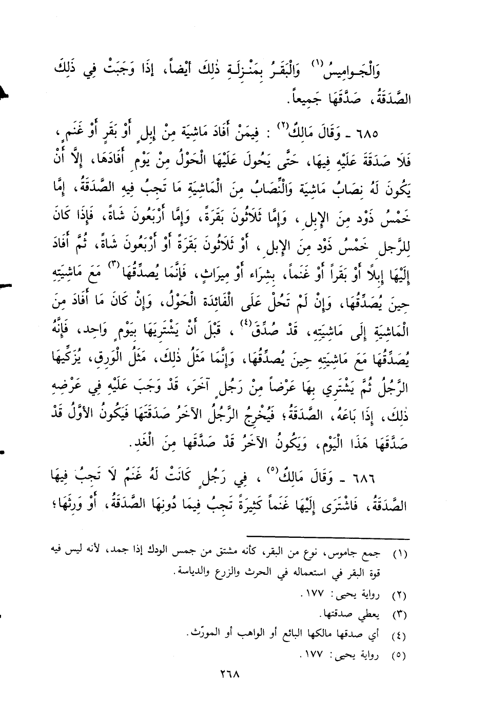 ٦٨٥ - وقَالَ مَالِكٌ: فيمَنْ أَفَادَ مَاشِيَةٌ مِنْ إِبِلٍ , أَوْ بَقَرٍ , أَوْ غَنَمٍ , فَلَا صَدَقَةَ عَلَيْهِ فِيهَا حَتَّى يَحُولَ عَلَيْهَا الْحَوْلُ مِنْ يَوْمَ أَفَادَهَا، إِلَاّ أَنْ يَكُونَ لَهُ نِصَابُ مَاشِيَةٍ، وَالنِّصَابُ من الماشية مَا تَجِبُ فِيهِ الصَّدَقَةُ، إِمَّا خَمْسُ ذَوْدٍ مِنَ الإِبِلِ، وَإِمَّا ثَلَاثُونَ بَقَرَةً، وَإِمَّا أَرْبَعُونَ شَاةً، فَإِذَا كَانَ لِلرَّجُلِ خَمْسُ ذَوْدٍ مِنَ الإِبِلِ، أَوْ ثَلَاثُونَ بَقَرَةً , أَوْ أَرْبَعُونَ شَاةً، ثُمَّ أَفَادَ إِلَيْهَا إِبِلاً , أَوْ بَقَرًا , أَوْ غَنَمًا، بِشْرَاءٍ , أَوْ مِيرَاثٍ، فَإِنَّما يُصَدِّقُهَا مَعَ مَاشِيَتِهِ حِينَ يُصَدِّقُهَا، وَإِنْ لَمْ تحُلْ عَلَى الْفَائِدَةِ الْحَوْلُ، وَإِنْ كَانَ مَا أَفَادَ مِنَ الْمَاشِيَةِ إِلَى مَاشِيَتِهِ، قَدْ صُدِّقَ قَبْلَ أَنْ يَشْتَرِيَهَا بِيَوْمٍ وَاحِدٍ فَإِنَّهُ يُصَدِّقُهَا مَعَ مَاشِيَتِهِ حِينَ يُصَدِّقُها، وَإِنَّمَا مَثَلُ ذَلِكَ، مَثَلُ الْوَرِقِ يُزَكِّيهَا الرَّجُلُ ثُمَّ يَشْتَرِي بِهَا عَرْضًا مِنْ رَجُلٍ آخَرَقَدْ وَجَبَ عَلَيْهِ فِي عَرْضِهِ ذَلِكَ، إِذَا بَاعَهُ، الصَّدَقَةُ، فَيُخْرِجُ الرَّجُلُ الآخَرُ صَدَقَتَهَا , فَيَكُونُ الأَوَّلُ قَدْ صَدَّقَهَا هَذَا الْيَوْمَ، وَيَكُونُ الآخَرُ قَدْ صَدَّقَهَا مِنَ الْغَدِ.