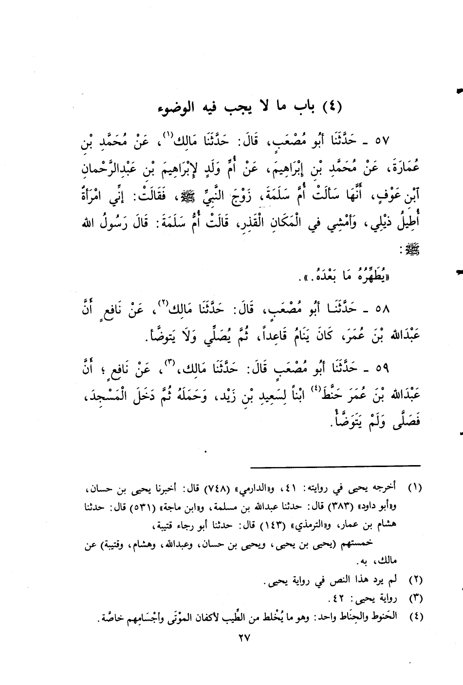 ٥٨ - حَدَّثَنَا أَبُو مُصْعَبٍ، قَالَ: حَدَّثَنَا مَالِكٌ، عَنْ نَافِعٍ، أَنَّ عبد الله بْنَ عُمَرَ كَانَ يَنَامُ قاعدا ثُمَّ يُصَلِّي وَلَا يَتَوَضَّأُ.