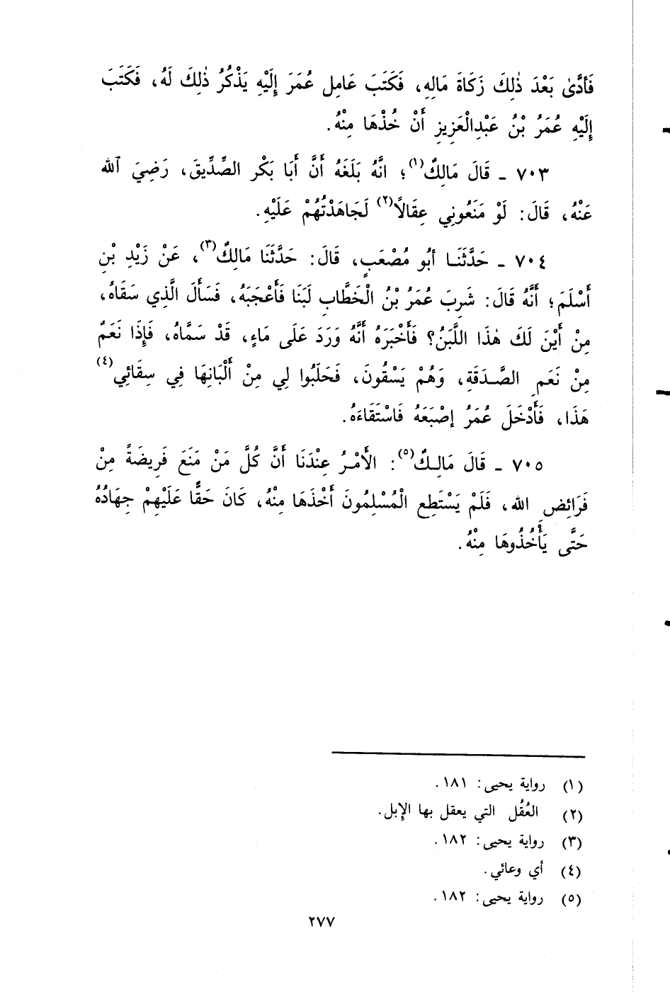٧٠٣ - قَالَ مَالِكٌ: أَنَّهُ بَلَغَهُ، أَنَّ أَبَا بَكْرٍ الصِّدِّيقَ - رضي الله عنه - قَالَ: لَوْ مَنَعُونِي عِقَالاً لَجَاهَدْتُهُمْ عَلَيْهِ.