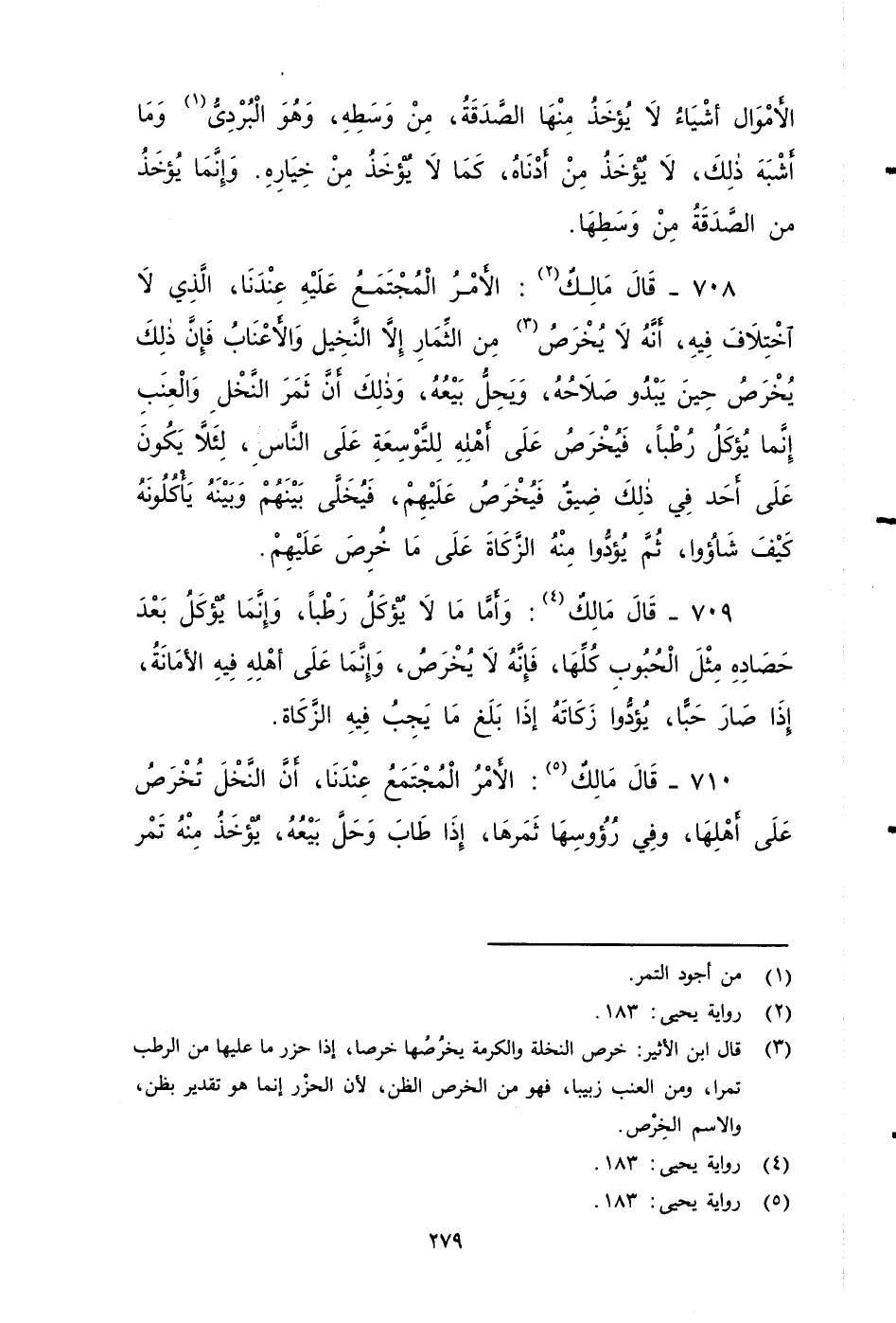 ٧٠٨ - قَالَ مَالِكٌ: الأََمْرُ الْمُجْتَمَعُ عَلَيْهِ عِنْدَنَا الذي لااختلاف فيه: أَنَّهُ لَا يُخْرَصُ مِنَ الثِّمَارِ إِلَاّ النَّخِيلُ , وَالأََعْنَابُ، فَإِنَّ ذَلِكَ يُخْرَصُ حِينَ يَبْدُو صَلَاحُهُ، وَيَحِلُّ بَيْعُهُ، وَذَلِكَ أَنَّ ثَمَرَ النَّخِلِ , وَالعْنَبِ يُؤْكَلُ رُطَبًا، فَيُخْرَصُ عَلَى أَهْلِهِ لِلتَّوْسِعَةِ عَلَى النَّاسِ، وَلِئَلَاّ يَكُونَ عَلَى أَحَدٍ فِي ذَلِكَ ضِيقٌ، فَيُخْرَصُ عَلَيْهِمْ، فيُخَلَّى بَيْنَهُمْ وَبَيْنَهُ يَأْكُلُونَهُ كَيْفَ شَاؤُوا، ثُمَّ يُؤَدُّوا مِنْهُ الزَّكَاةَ عَلَى مَا خُرِصَ عَلَيْهِمْ.