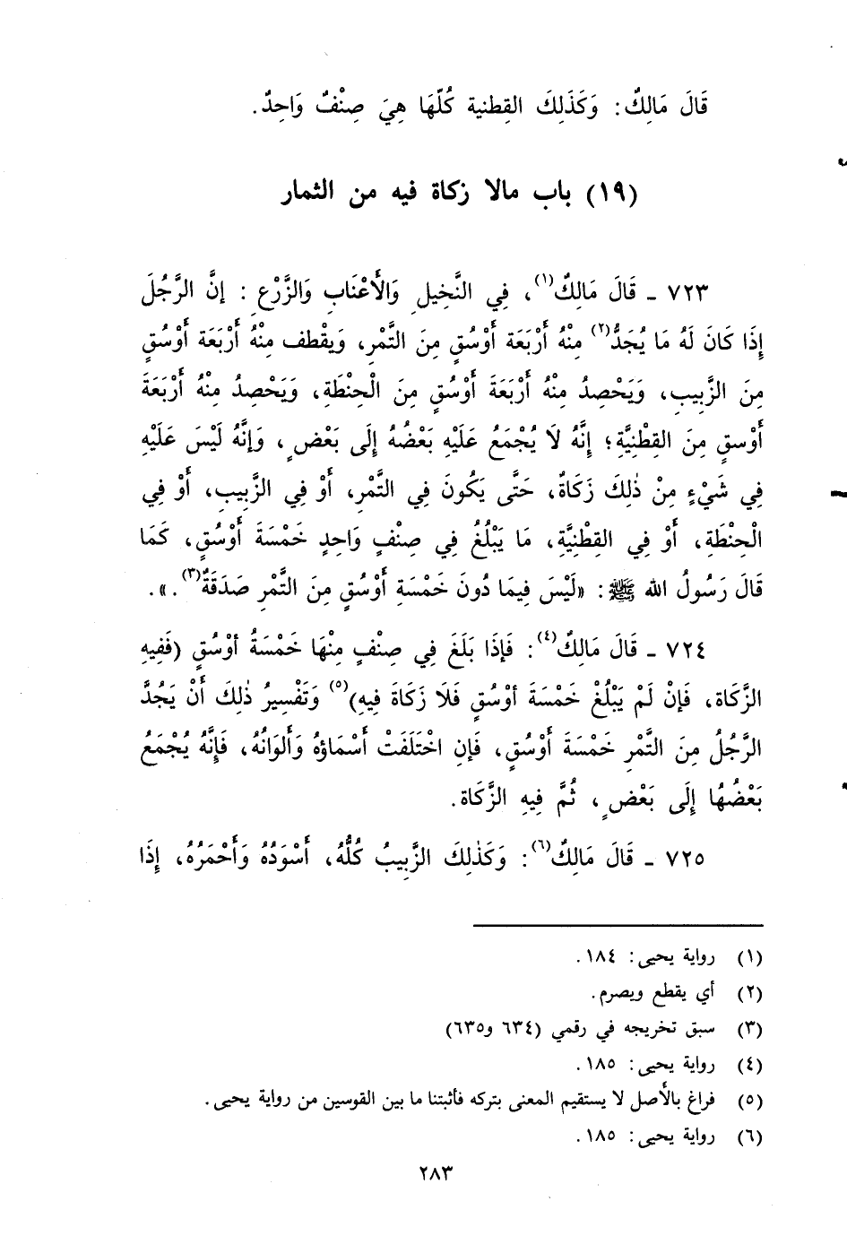 ٧٢٣ - قَالَ مَالِكٌ: في النخيل والأعناب والزرع إِنَّ الرَّجُلَ إِذَا كَانَ لَهُ مَا يَجُدُّ مِنْهُ أَرْبَعَةَ أَوْسُقٍ مِنَ التَّمْرِ، وَيَقْطُفُ مِنْهُ أَرْبَعَةَ أَوْسُقٍ مِنَ الزَّبِيبِ، وَيَحْصُدُ مِنْهُ أَرْبَعَةَ أَوْسُقٍ مِنَ الْحِنْطَةِ، وَيَحْصُدُ مِنْهُ أَرْبَعَةَ أَوْسُقٍ مِنَ الْقُِطْنِيَّةِ , إِنَّهُ لَا يُجْمَعُ عَلَيْهِ بَعْضُه إِلَى بَعْضٍ، وَإِنَّهُ لَيْسَ عَلَيْهِ فِي شَيْءٍ مِنْ ذَلِكَ زَكَاةٌ، حَتَّى يَكُونَ فِي التَّمْرِ، أَوْ فِي الزَّبِيبِ، أَوْ فِي الْحِنْطَةِ، أَوْ فِي الْقُِطْنِيَّةِ، مَا يَبْلُغُ في صِّنْفُ وَاحِدُ خَمْسَةَ أَوْسُقٍ , كَمَا قَالَ رَسُولُ اللهِ صَلَّى اللَّهُ عَلَيْهِ وَسَلَّمَ: لَيْسَ فِيمَا دُونَ خَمْسَةِ أَوْسُقٍ مِنَ التَّمْرِ صَدَقَةٌ.