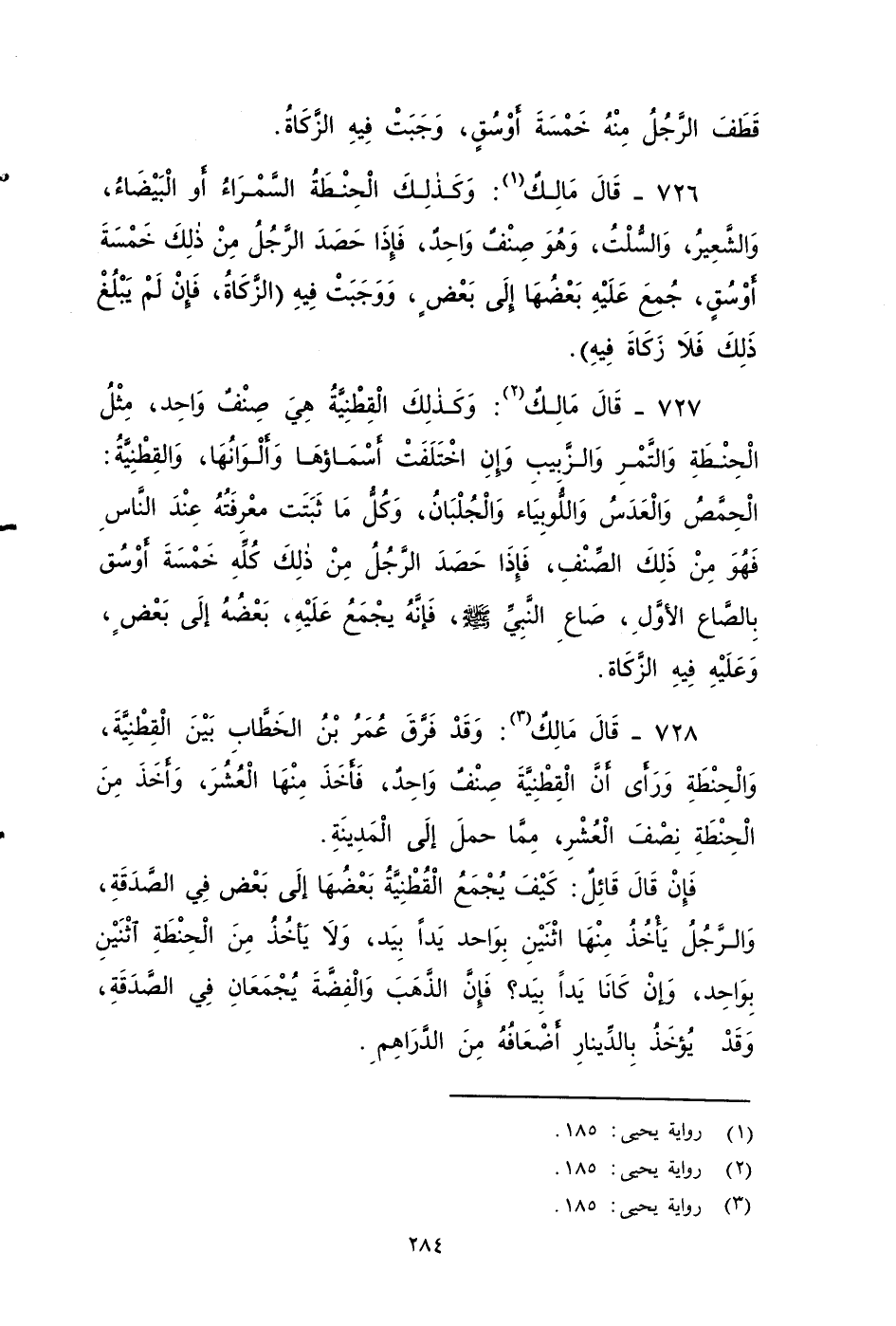 ٧٢٨ - قَالَ مَالِكٌ: وَقَدْ فَرَّقَ عُمَرُ بْنُ الْخَطَّابِ بَيْنَ الْقُِطْنِيَّةِ وَالْحِنْطَةِ , وَرَأَى أَنَّ الْقُِطْنِيَّةَ صِنْفٌ وَاحِدٌ، فَأَخَذَ مِنْهَا الْعُشْرَ، وَأَخَذَ مِنَ الْحِنْطَةِ نِصْفَ الْعُشْرِمما حمل إلى المدينة.