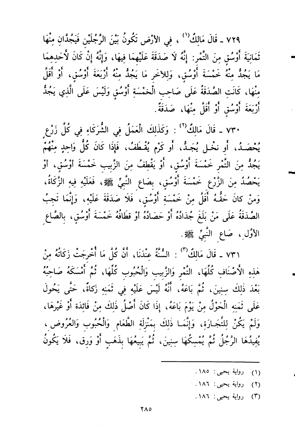 ٧٣٠ - قَالَ مَالِكٌ: وَكَذَلِكَ الْعَمَلُ فِي الشُّرَكَاءِ فِي كُلِّ زَرْعٍ يُحْصَدُ، أَوِ نَخْلٍ يُجَدُّ , أَوِ كَرْمٍ يُقْطَفُ، فَإِذَا كَانَ كُلُّ واحد مِنْهُمْ يَجُد مِنَ التَّمْرِ خَمْسَةَ أَوْسُقٍ، أَوْ يَقْطِفُ مِنَ الزَّبِيبِ، خَمْسَةَ أَوْسُقٍ، أَوْ يَحْصُدُ مِنَ الْزرع خَمْسَةَ أَوْسُقٍ، بصاع النبي صَلى الله عَلَيه وَسَلم فَعَلَيْهِ فِيهِ الزَّكَاةُ، وَمَنْ كَانَ حَقُّهُ أَقَلَّ مِنْ خَمْسَةِ أَوْسُقٍ , فَلَا صَدَقَةَ عَلَيْهِ، وَإِنَّمَا تَجِبُ الصَّدَقَةُ عَلَى مَنْ بَلَغَ جُدَادُهُ أَوْ حَصَادُهُ أَوْ قِطَافُهُ خَمْسَةَ أَوْسُقٍ بالصاع الأول صاع النبي صَلى الله عَلَيه وَسَلم.
