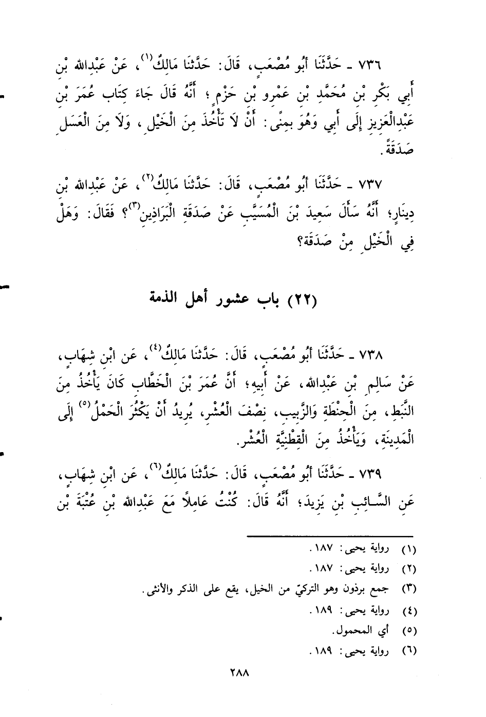 ٧٣٦ - حَدَّثَنَا أَبُو مُصْعَبٍ، قَالَ: حَدَّثَنَا مَالِكٌ، عَنْ عَبْدِ اللهِ بْنِ أَبِي بَكْرِ بْنِ مُحَمَّدِ بْنِ عَمْرِو بْنِ حَزْمٍ، أَنَّهُ قَالَ: جَاءَ كِتَابٌ مِنْ عُمَرَ بْنِ عَبْدِ الْعَزِيزِ إِلَى أَبِي وَهُوَ بِمِنًى , أَنْ لَاتأْخُذَ مِنَ الْخَيْلِ وَلَا مِنَ الْعَسَلِ صَدَقَةً.