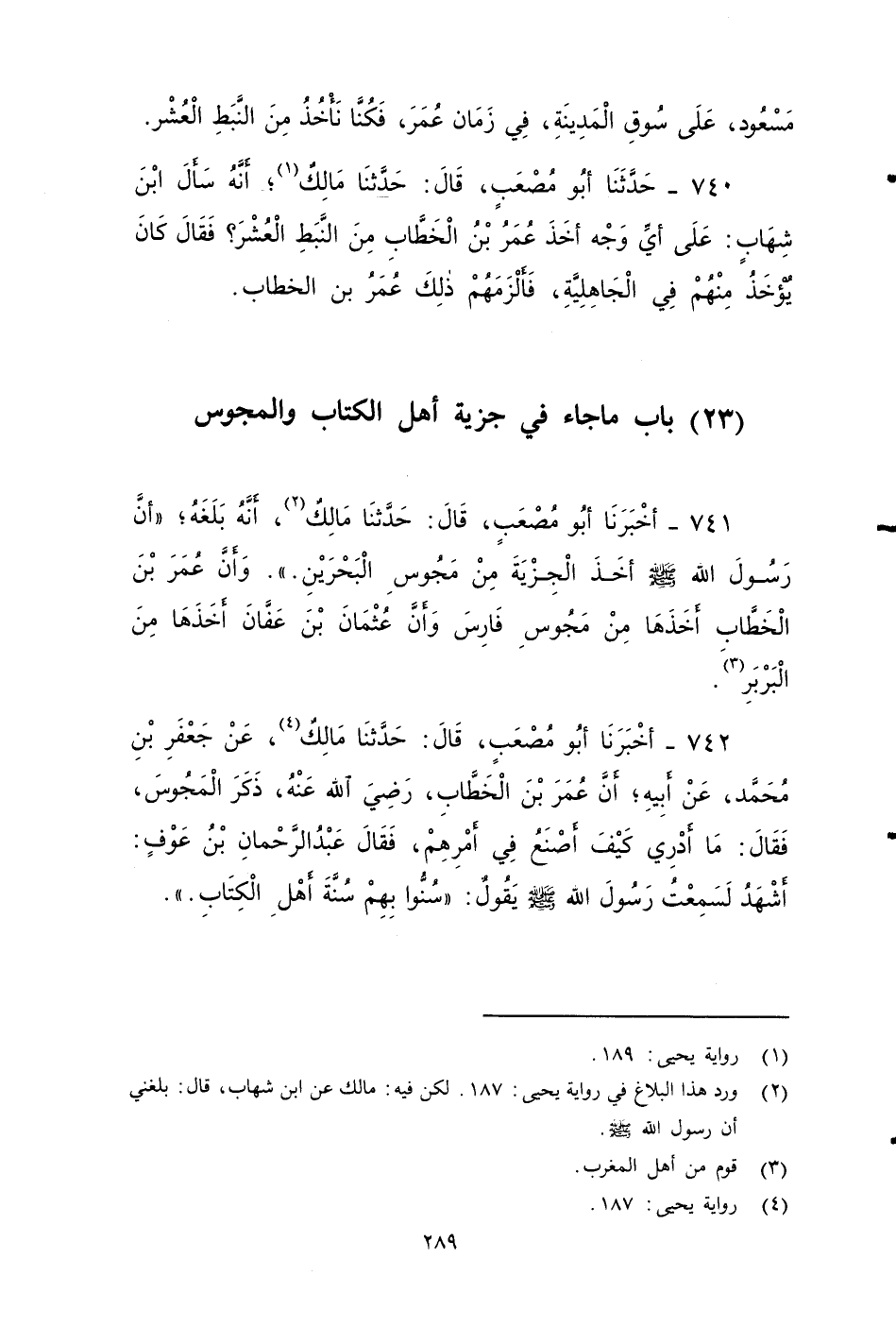 ٧٤١ - أخبرنا أَبُو مُصْعَبٍ، قَالَ: حَدَّثَنَا مَالِكٌ، أَنَّهُ بَلَغَهُ، أَنَّ رَسُولَ اللَّهِ صَلى الله عَلَيه وَسَلم: أَخَذَ الْجِزْيَةَ مِنْ مَجُوسِ الْبَحْرَيْنِ، وَأَنَّ عُمَرَ بْنَ الْخَطَّابِ: أَخَذَهَا مِنْ مَجُوسِ فَارِسَ وَأَنَّ عُثْمَانَ بْنَ عَفَّانَ: أَخَذَهَا مِنْ الْبَرْبَرِ.