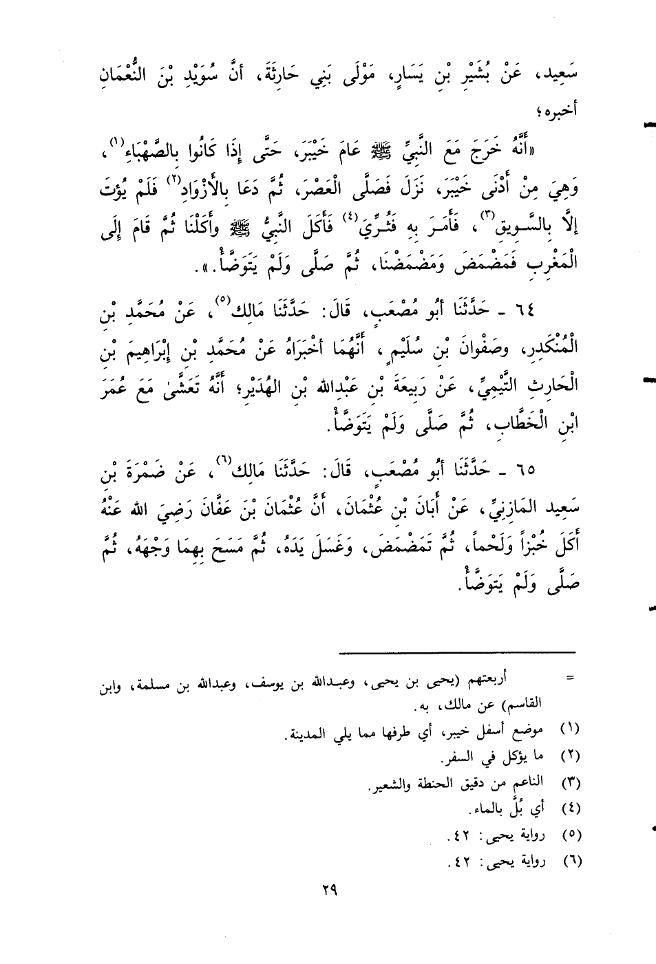 ٦٣ - حَدَّثَنَا أَبُو مُصْعَبٍ، قَالَ: حَدَّثَنَا مَالِكٌ، عَنْ يَحْيَى بْنِ سَعِيدٍ، عَنْ بُشَيْرِ بْنِ يَسَارٍ مَوْلَى بَنِي حَارِثَةَ، عَنْ سُوَيْدِ بْنِ النُّعْمَانِ، أَخْبَرَهُ: أَنَّهُ خَرَجَ مَعَ النبي صَلى الله عَلَيه وَسَلم عَامَ خَيْبَرَ، حَتَّى إِذَا كَانُوا بِالصَّهْبَاءِ، وَهِيَ مِنْ أَدْنَى خَيْبَرَ، نزل فَصَلَّى الْعَصْرَ، ثُمَّ دَعَا بِالْأَزْوَادِ، فَلَمْ يُؤْتَ إِلَّا بِالسَّوِيقِ، فَأَمَرَ بِهِ فَثُرِّيَ، فَأَكَلَ النبي صَلى الله عَلَيه وَسَلم، وَأَكَلْنَا، ثُمَّ قَامَ إِلَى الْمَغْرِبِ، فَمَضْمَضَ وَمَضْمَضْنَا، ثُمَّ صَلَّى وَلَمْ يَتَوَضَّأْ.