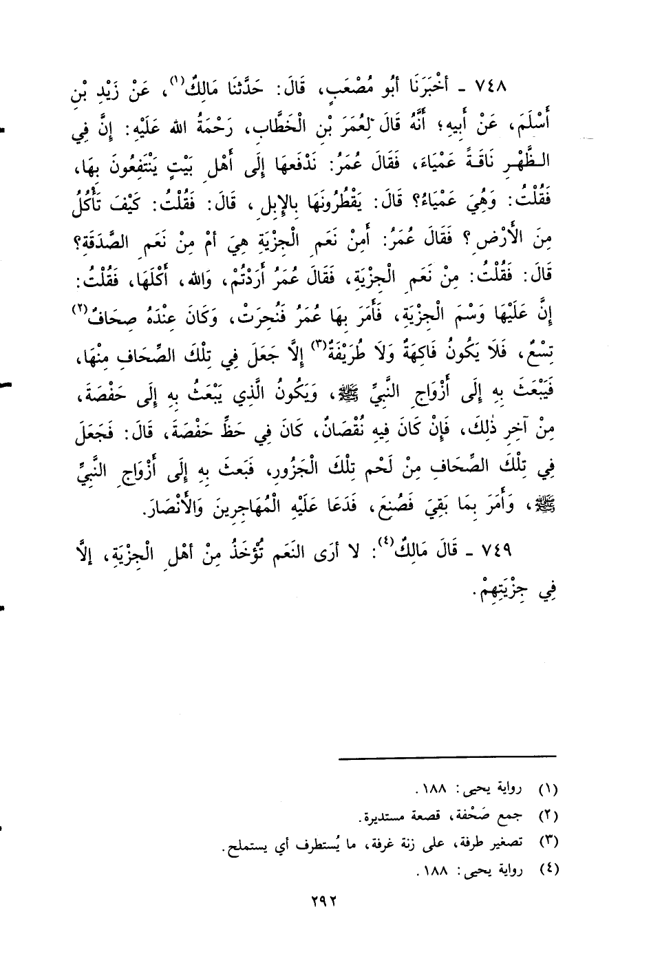٧٤٨ - أخبرنا أَبُو مُصْعَبٍ، قَالَ: حَدَّثَنَا مَالِكٌ، عَنْ زَيْدِ بْنِ أَسْلَمَ، عَنْ أَبِيهِ , أَنَّهُ قَالَ لِعُمَرَ بْنِ الْخَطَّابِ رحمة الله عليه: إِنَّ فِي الظَّهْرِ نَاقَةً عَمْيَاءَ، فَقَالَ عُمَرُ: ندْفَعْهَا إِلَى أَهْلِ بَيْتٍ يَنْتَفِعُونَ بِهَا، فَقُلْتُ: وَهِيَ عَمْيَاءُ؟ قَالَ: يَقْطُرُونَهَا بِالإِبِلِ , قَالَ: فَقُلْتُ: كَيْفَ تَأْكُلُ مِنَ الأََرْضِ؟ فَقَالَ عُمَرُ: أَمِنْ نَعَمِ الْجِزْيَةِ هِيَ , أَمْ مِنْ نَعَمِ الصَّدَقَةِ؟ قال: فَقُلْتُ: مِنْ نَعَمِ الْجِزْيَةِ، فَقَالَ عُمَرُ: أَرَدْتُمْ، وَاللَّهِ، أَكْلَهَا، فَقُلْتُ: إِنَّ عَلَيْهَا وَسْمَ الْجِزْيَةِ، فَأَمَرَ بِهَا عُمَرُ , فَنُحِرَتْ، وَكَانَ عِنْدَهُ صِحَافٌ تِسْعٌ، فَلَا تَكُونُ فَاكِهَةٌ وَلَا طُرَيْفَةٌ , إِلَاّ جَعَلَ مِنْهَا فِي تِلْكَ الصِّحَافِ، فَيبَعَثَ بِهَ إِلَى أَزْوَاجِ النَّبِيِّ صَلَّى اللَّهُ عَلَيْهِ وَسَلَّمَ، وَيَكُونُ الَّذِي يَبْعَثُ بِهِ إِلَى حَفْصَةَ مِنْ آخِرِ ذَلِكَ، فَإِنْ كَانَ فِيهِ نُقْصَانٌ، كَانَ فِي حَظِّ حَفْصَةَ، قَالَ: فَجَعَلَ فِي تِلْكَ الصِّحَافِ مِنْ لَحْمِ تِلْكَ الْجَزُورِ، فَبَعَثَ بِهِ إِلَى أَزْوَاجِ النَّبِيِّ صَلَّى اللَّهُ عَلَيْهِ وَسَلَّمَ، وَأَمَرَ بِمَا بَقِيَ، فَصُنِعَ , فَدَعَا عَلَيْهِ الْمُهَاجِرِينَ وَالأََنْصَارَ.