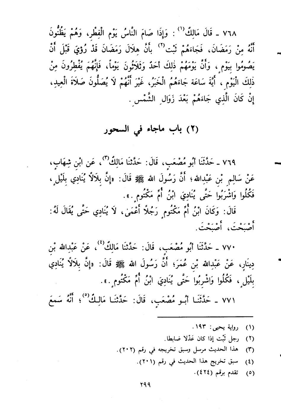 ٧٧٠ - حَدَّثَنَا أَبُو مُصْعَبٍ، قَالَ: حَدَّثَنَا مَالِكٌ، عَنْ عَبْدِ اللَّهِ بْنِ دِينَارٍ، عَنْ عَبْدِ اللَّهِ بْنِ عُمَرَ، أَنَّ رَسُولَ اللَّهِ صَلى الله عَلَيه وَسَلم، قَالَ: إِنَّ بِلَالًا يُنَادِي بِلَيْلٍ، فَكُلُوا وَاشْرَبُوا حَتَّى يُنَادِيَ ابْنُ أُمِّ مَكْتُومٍ.
